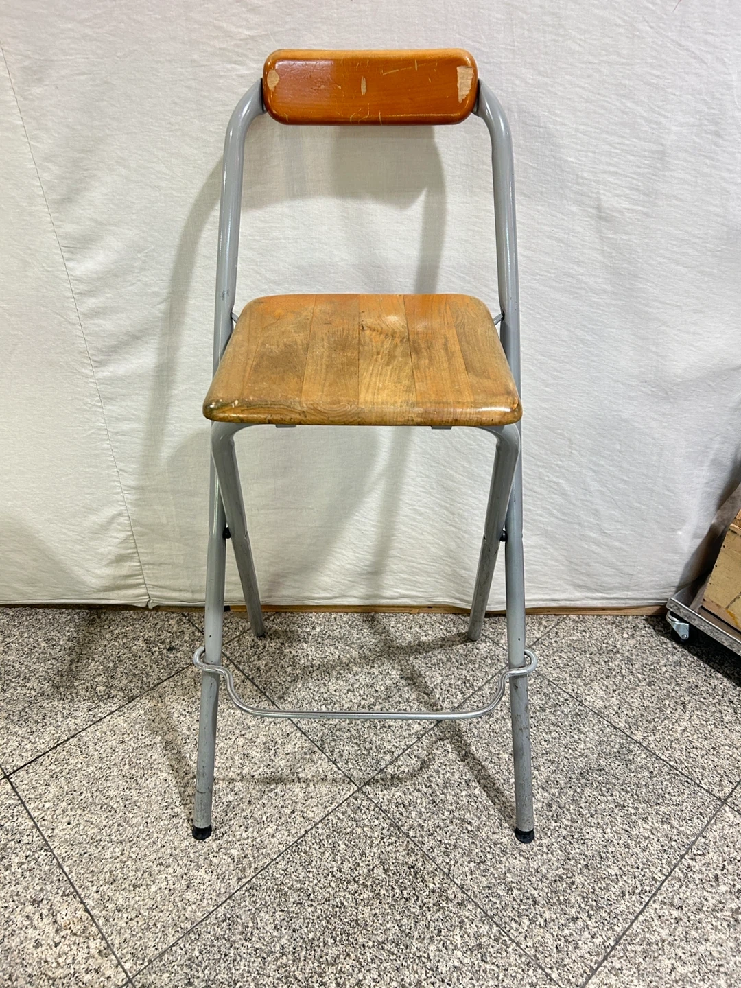 I'm selling a folding bar stool with a wooden seat and backrest, and a metal frame. It's perfect for adding extra seating to your kitchen or bar area. The stool folds easily for storage when not in use. It has some signs of use on the wooden parts.