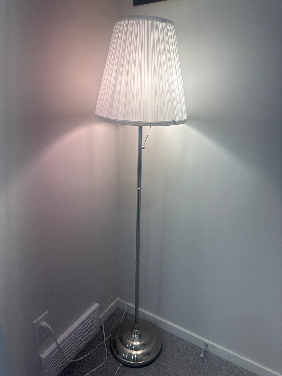 This floor lamp features a white pleated shade and a brushed nickel finish. It's designed to provide ambient lighting for any room. The adjustable pole allows for height customization. Great for adding a touch of elegance to your living space!