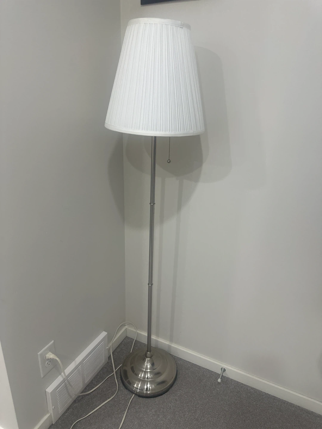 This floor lamp features a white pleated shade and a brushed nickel finish. It's designed to provide ambient lighting for any room. The adjustable pole allows for height customization. Great for adding a touch of elegance to your living space!