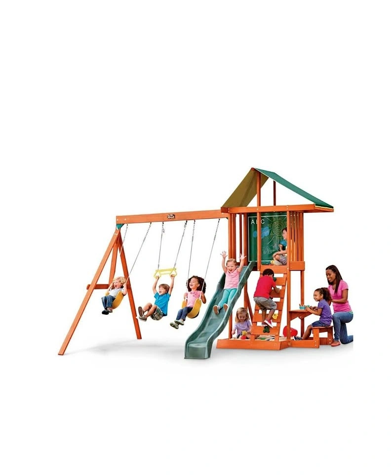 Brand New In Box. High rail wave slide provides an exciting and secure sliding experience. Belt swings and acro bar with grips let kids enjoy hours of swinging fun. Attached picnic table and bench with café-style striped awning for snack breaks. Rock wall ladder leads to an upper clubhouse with a vinyl chalkboard wall for creativity. Accommodates up to 9 children aged 3–10, with a maximum weight of 110 lbs (49.8 kg) per child. Assembled Dimensions: 12'11" L x 12'9" W x 9' H. Feel free to message if you have any questions!