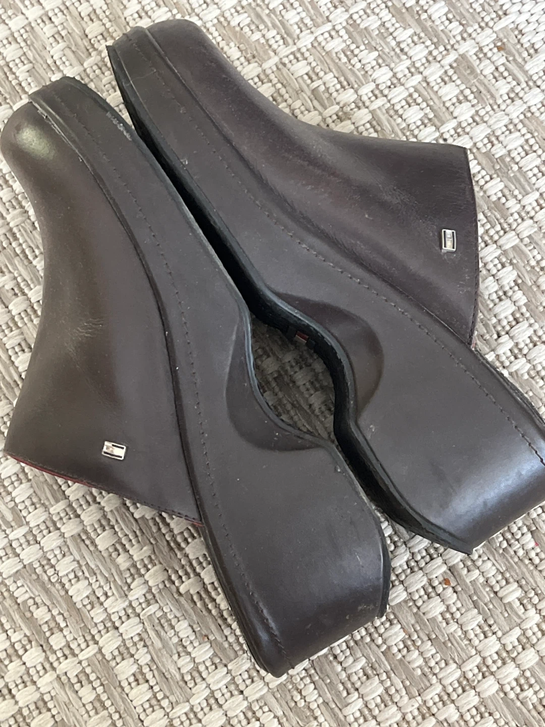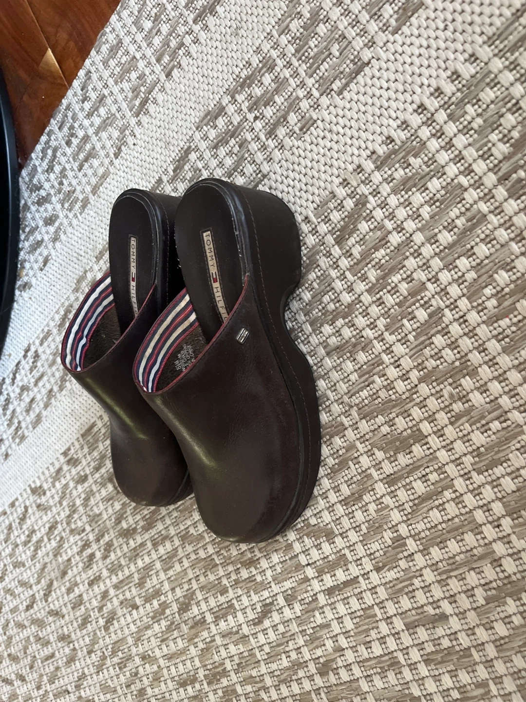 Comfortable Tommy Hilfiger wedge clogs in a rich brown colour. These shoes have a classic slip-on design with a sturdy wedge heel. Perfect for adding a bit of height to your everyday outfits! Worn Once! Priced to Sell $15 First Come PU Bolton