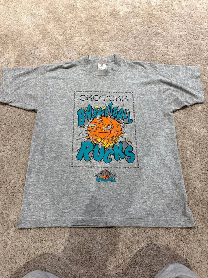 Cool graphic tee for basketball fans. Shirt has 'Okotoks Basketball Rocks' design with a flaming basketball. Gray color. Best brand shirt. Great for casual wear or showing team spirit. No rips or stains.