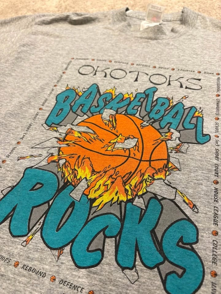 Cool graphic tee for basketball fans. Shirt has 'Okotoks Basketball Rocks' design with a flaming basketball. Gray color. Best brand shirt. Great for casual wear or showing team spirit. No rips or stains.