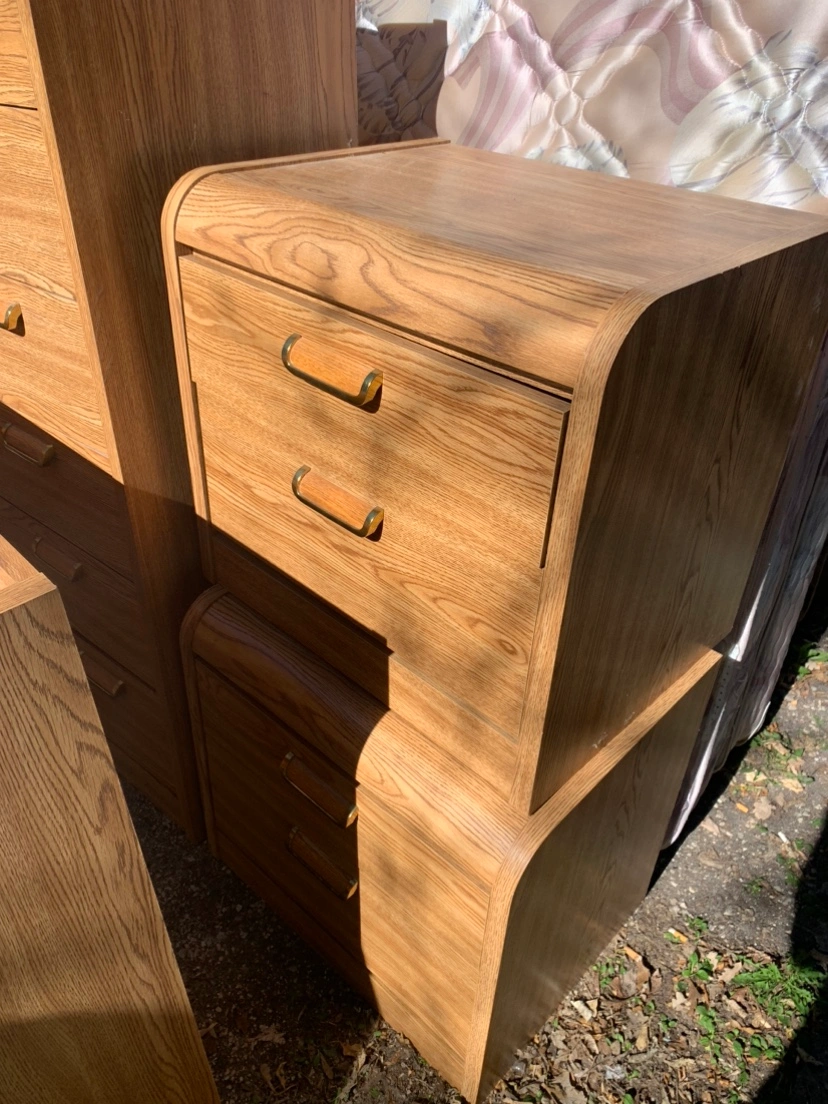 Headboard, frame, armoire, nightstands x 2, box spring and mattress.