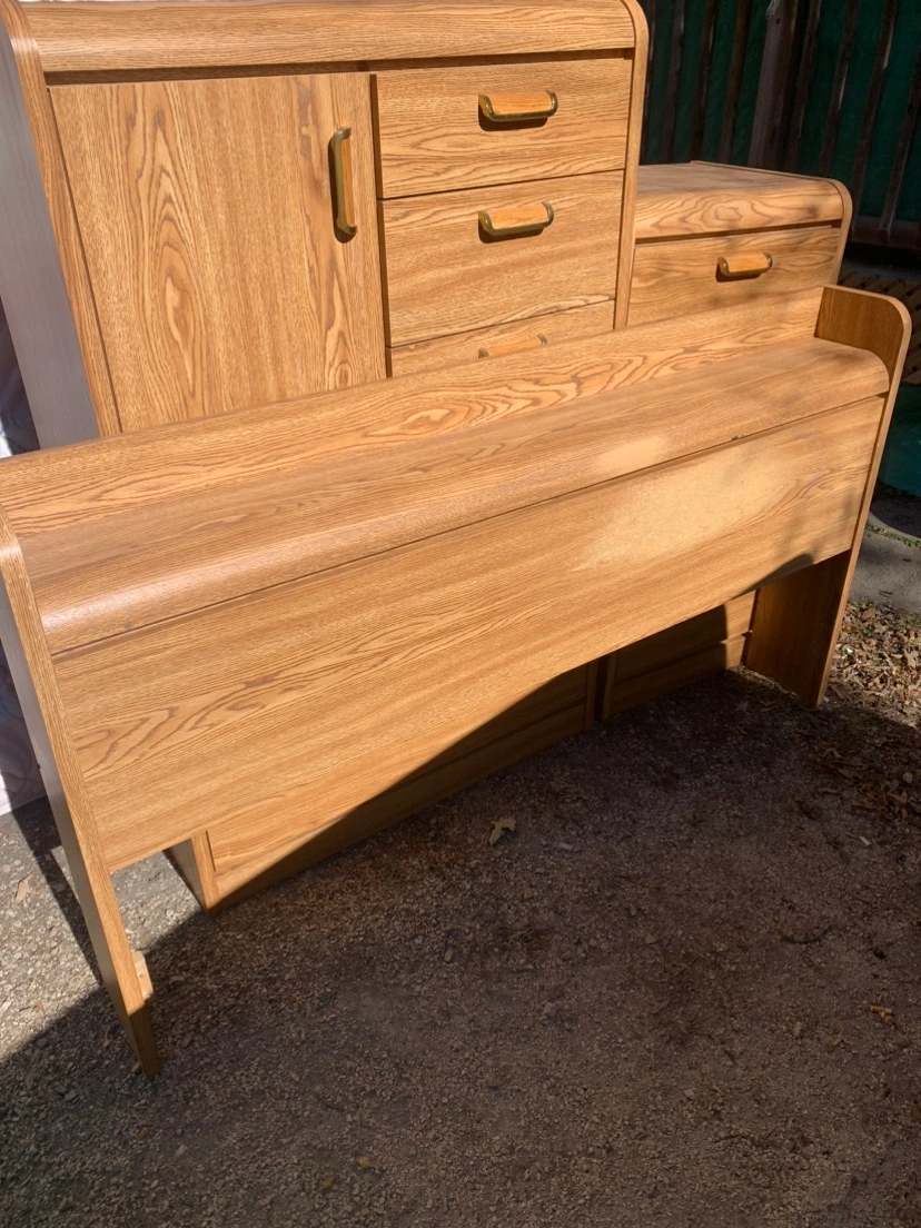 Couple of blemishes as seen in photos but nothing major and bottom of headboard is chipped where screws go but still functional