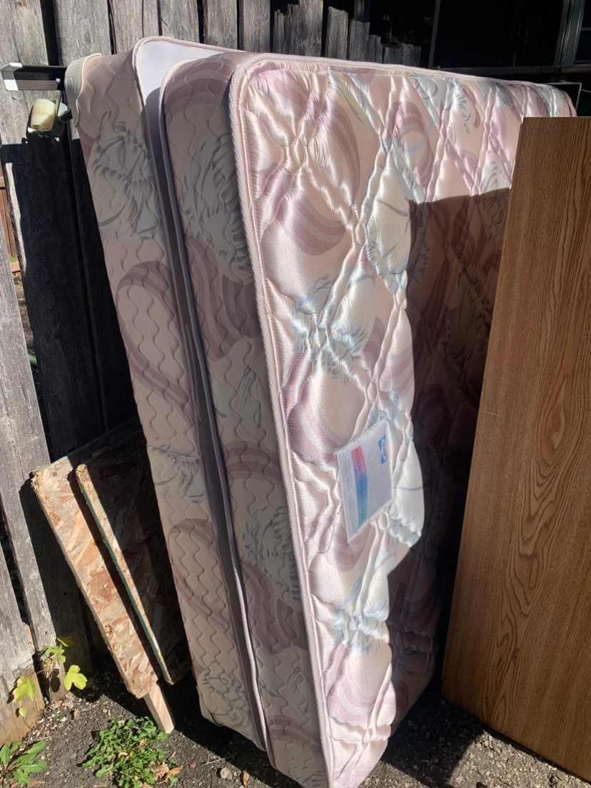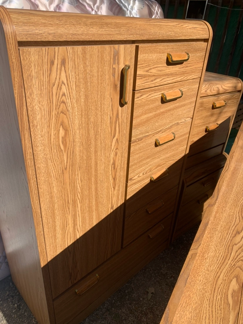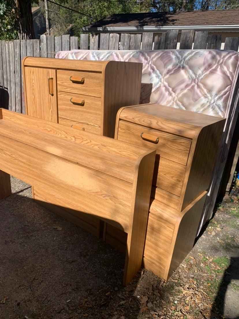 Headboard, frame, armoire, nightstands x 2, box spring and mattress.