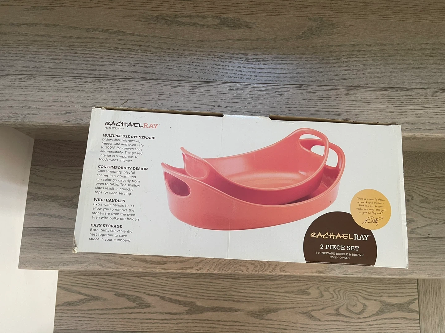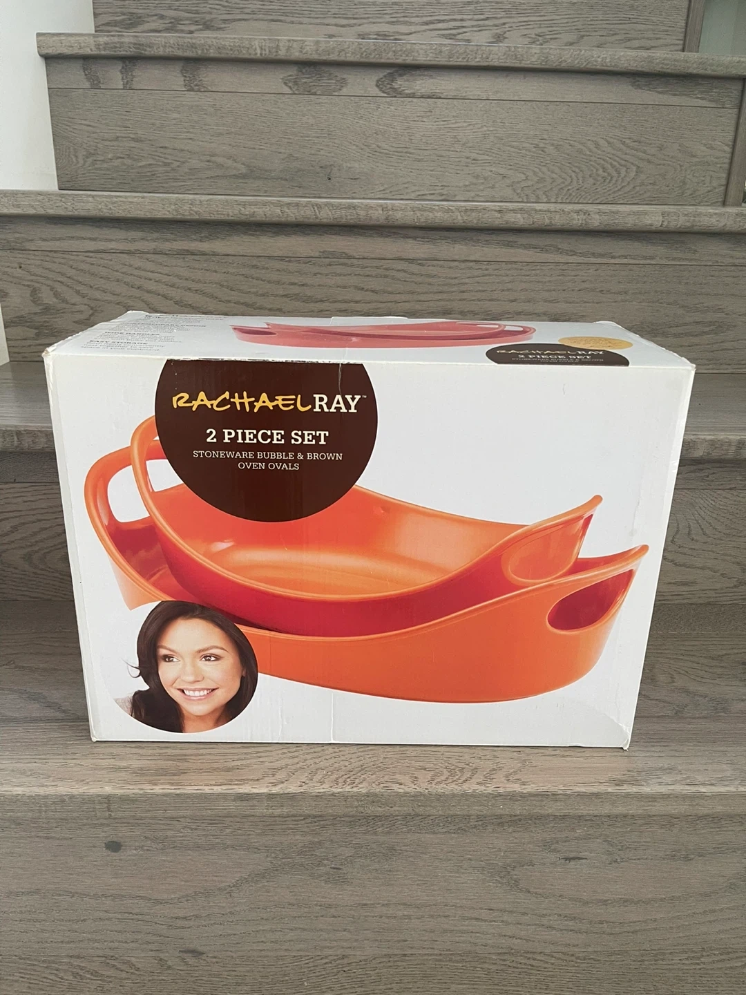 This brand new never used Rachael Ray 2-piece stoneware oven oval set is perfect for baking and serving. It's oven safe to 500°F and features wide handles for easy gripping. The contemporary design with vibrant glaze looks great on any table. Great for roasts or casseroles!