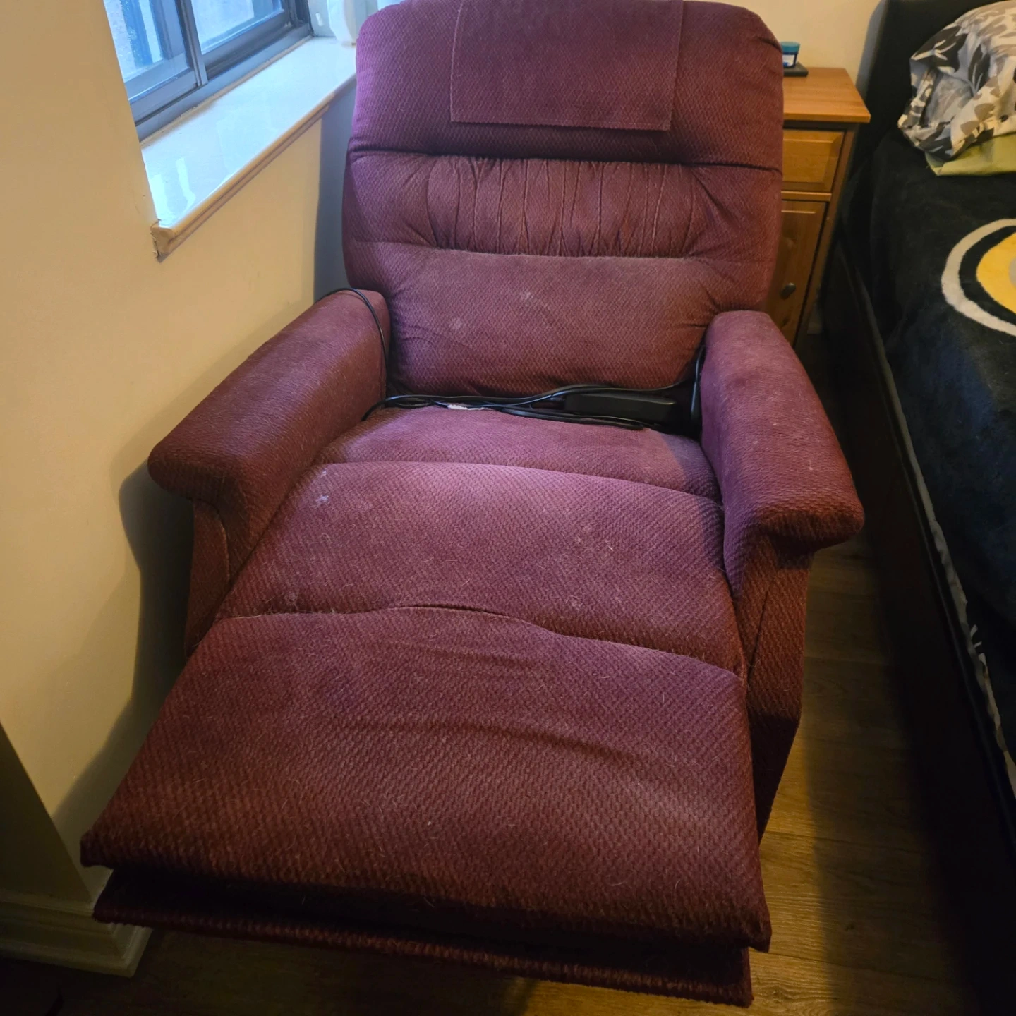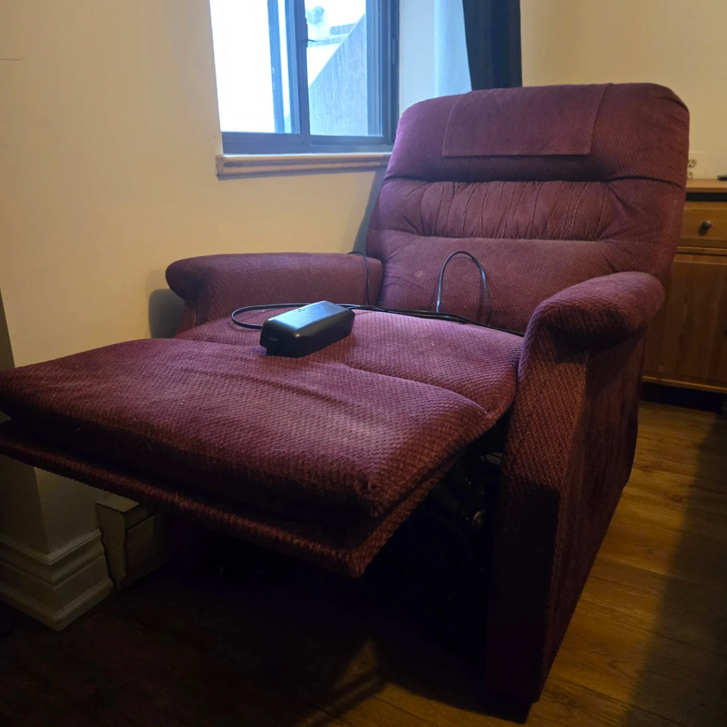 This burgundy recliner chair offers a lift function for easy standing. It's upholstered in a durable fabric. The chair includes a power cord and remote for operation
