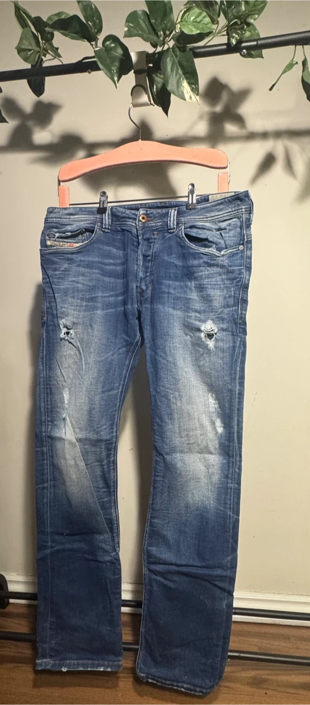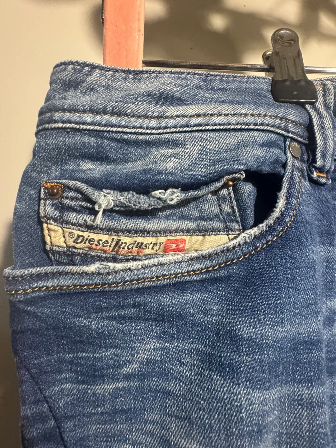 These are blue denim jeans from Diesel Industry. They feature distressed detailing and a button-fly closure. Perfect for casual wear!