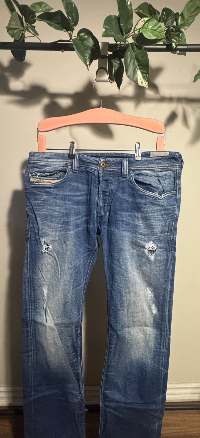 These are blue denim jeans from Diesel Industry. They feature distressed detailing and a button-fly closure. Perfect for casual wear!