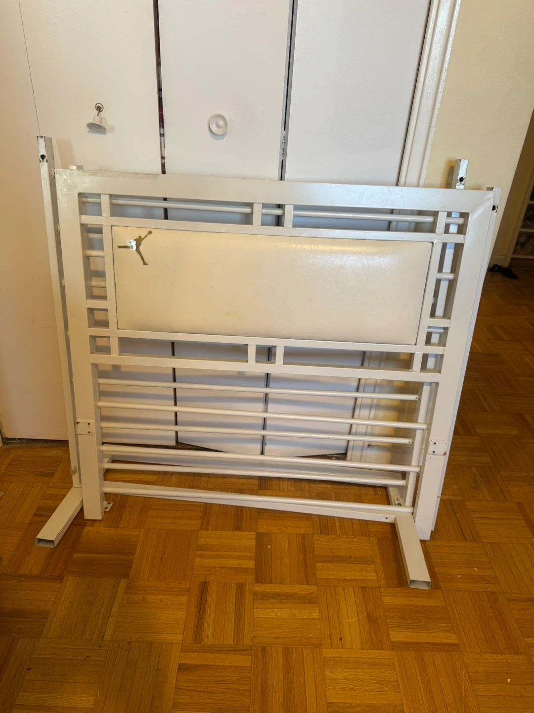 White single bed frame from IKEA. Includes wooden slats for mattress support. Sturdy metal frame.