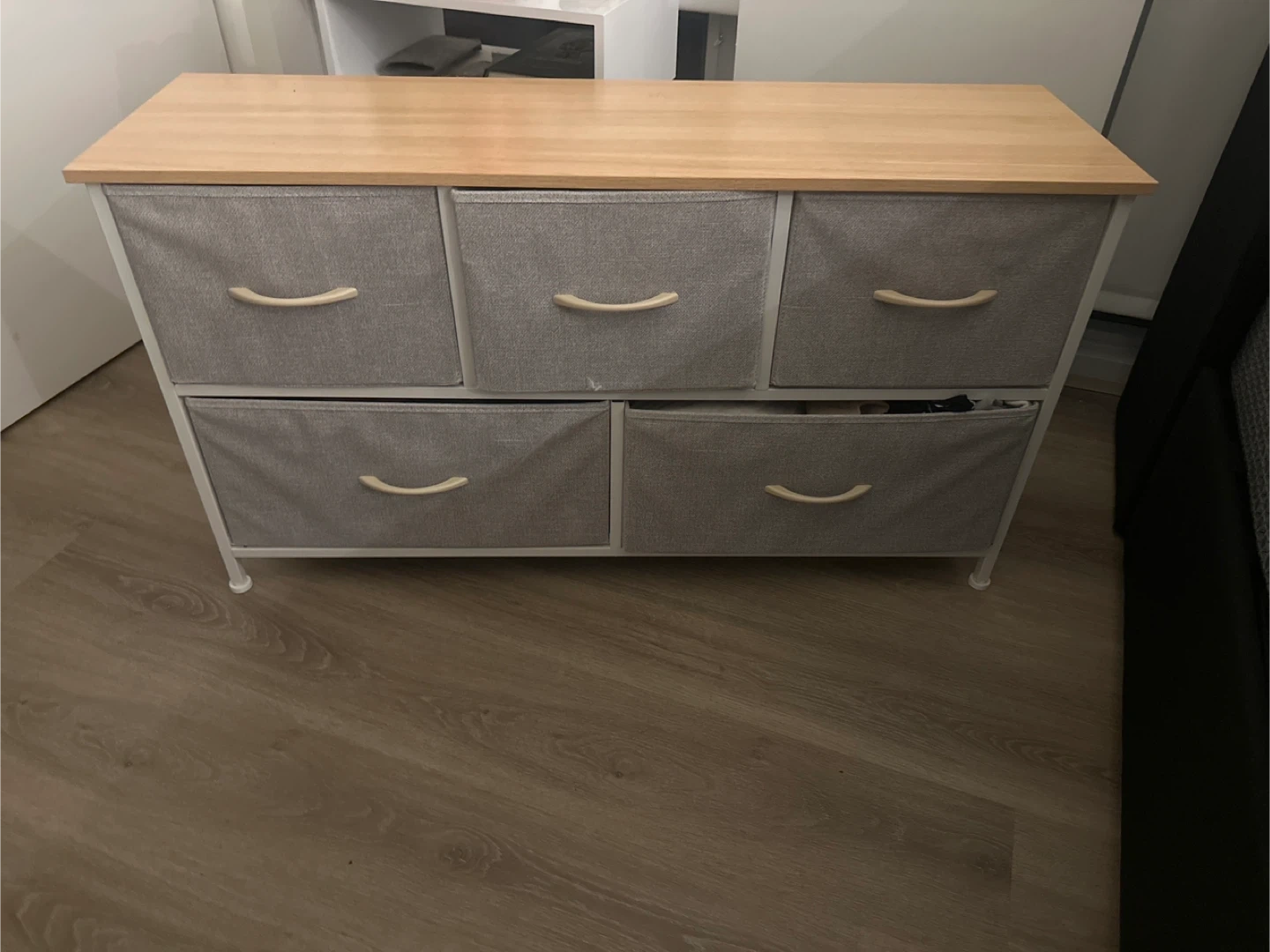 A 5-drawer fabric dresser with a wood-look top and grey fabric bins. It has five drawers with wooden handles. This dresser is great for organizing clothes or small items.