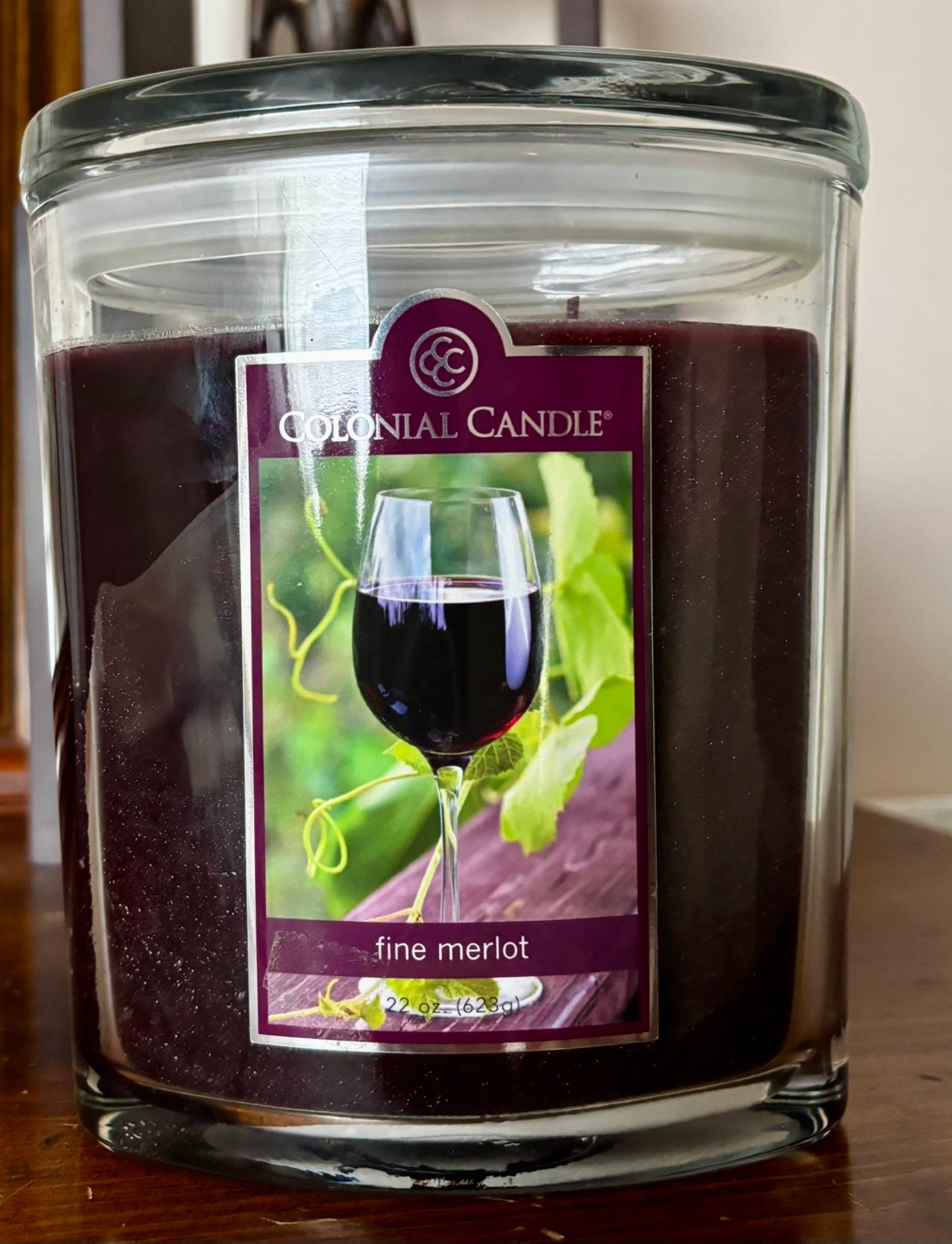 Colonial Large jar candle. Unique and Elegant Fine Merlot scent. 22 oz (623 g). Oval Glass jar with lid.