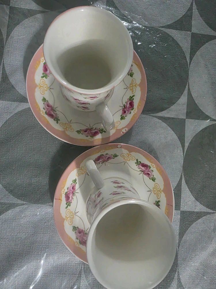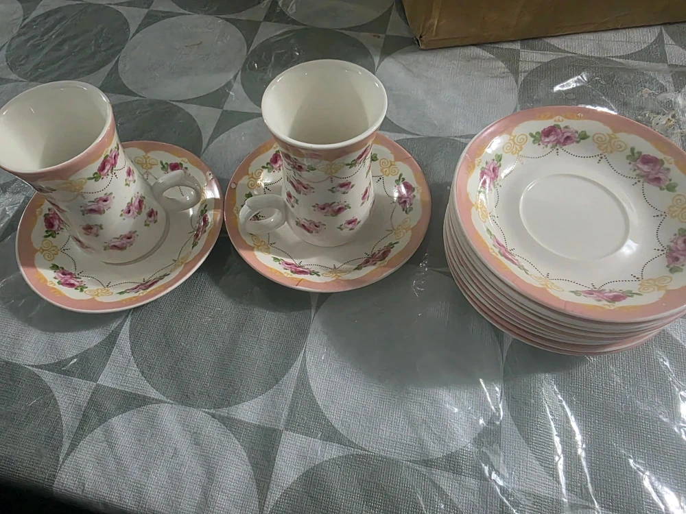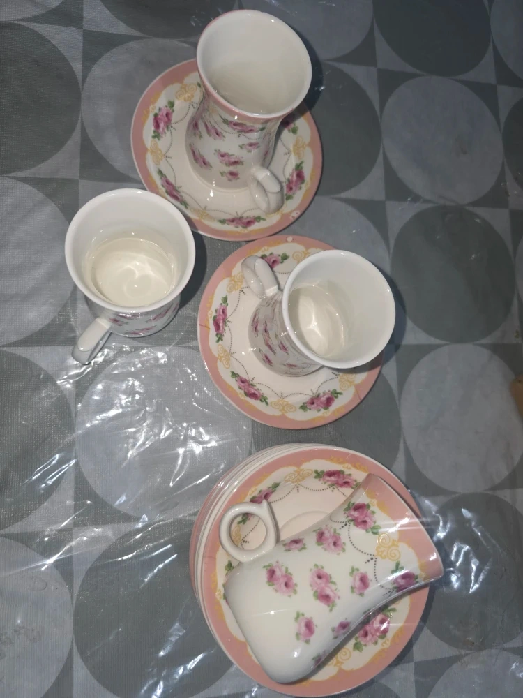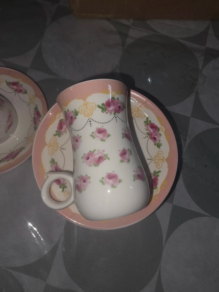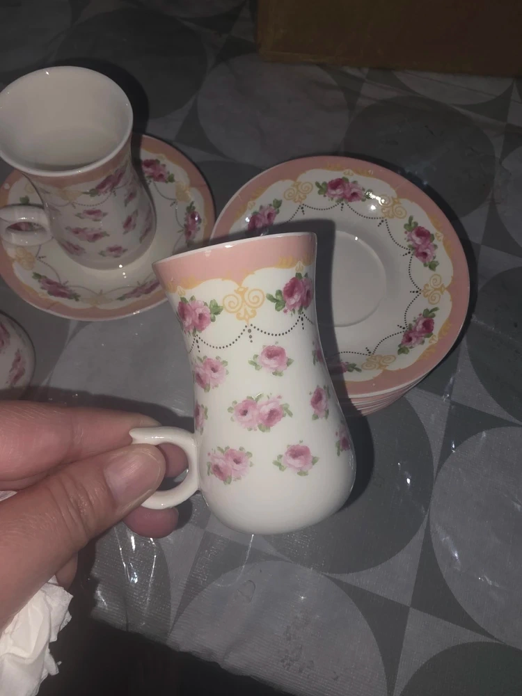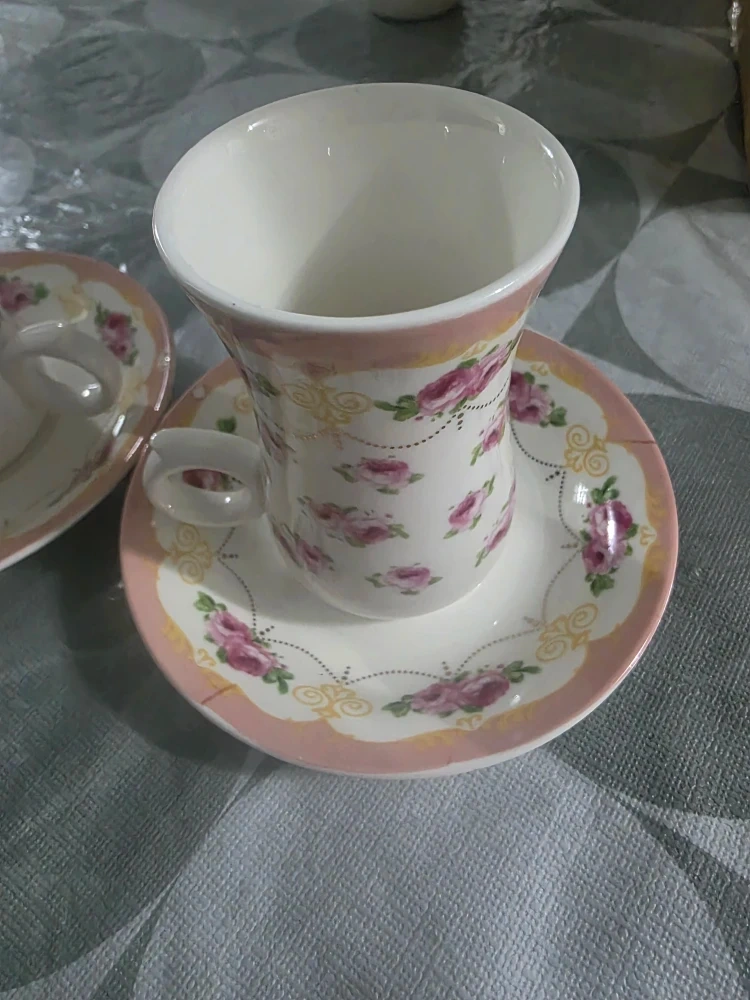Selling a set of tea cups and saucers, featuring a delicate floral design. The cups have a unique, slightly curved shape and a comfortable handle. The saucers are decorated with matching floral patterns and a light pink trim. Perfect for enjoying a cup of tea with friends or family. Only used 2 times.