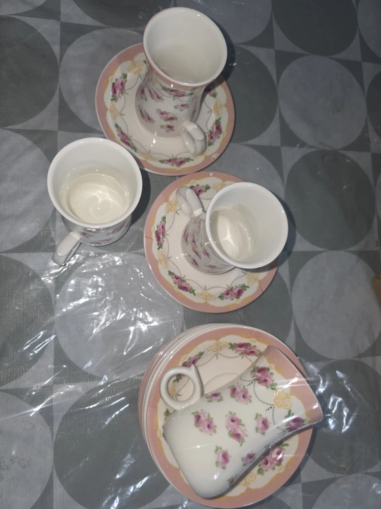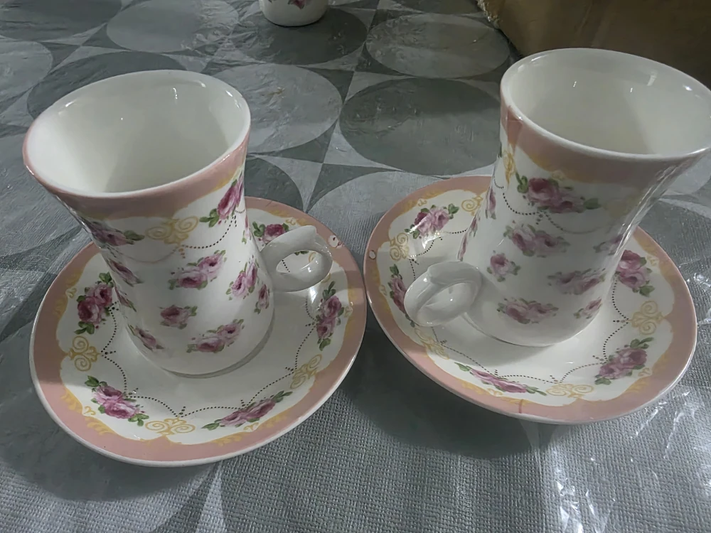 Selling a set of tea cups and saucers, featuring a delicate floral design. The cups have a unique, slightly curved shape and a comfortable handle. The saucers are decorated with matching floral patterns and a light pink trim. Perfect for enjoying a cup of tea with friends or family. Only used 2 times.