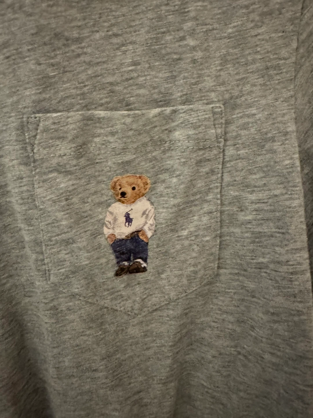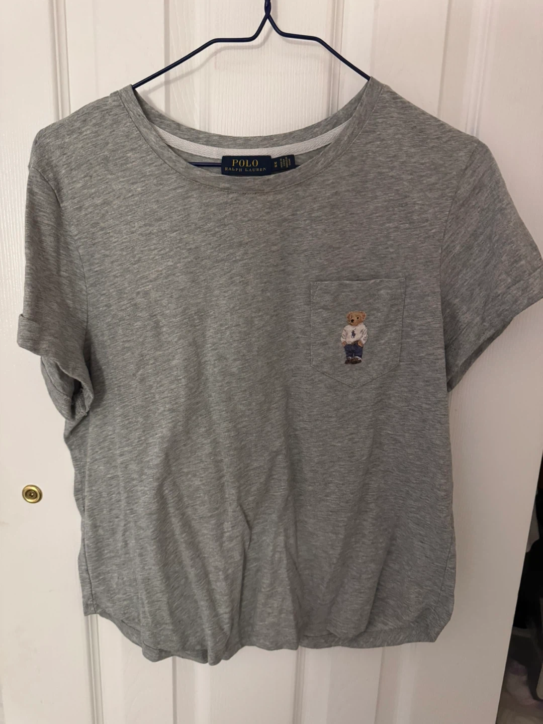 Grey Polo Ralph Lauren t-shirt with a classic teddy bear embroidered on the chest pocket. It's made of comfortable material and features short sleeves. Size is medium.
