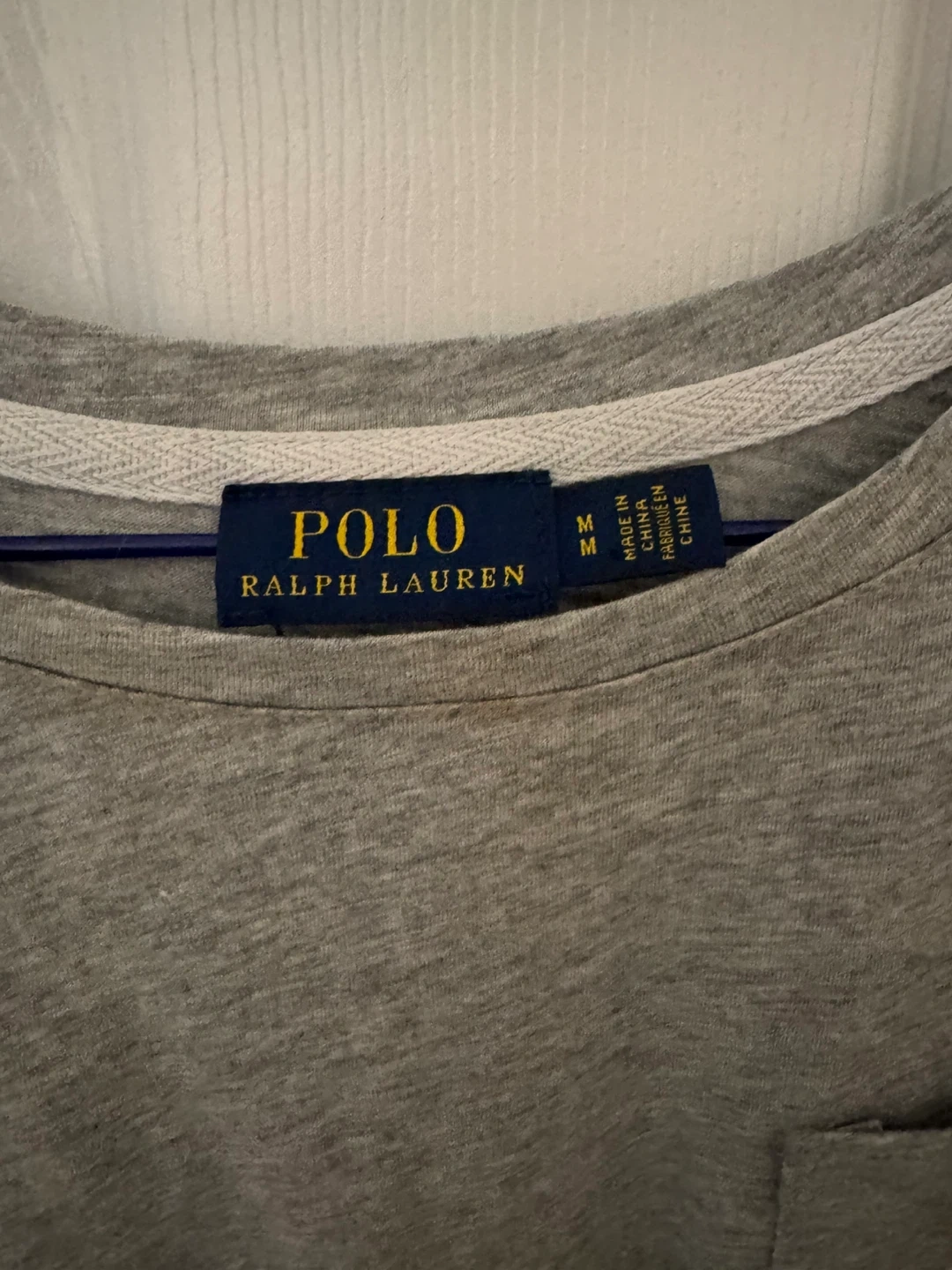 Grey Polo Ralph Lauren t-shirt with a classic teddy bear embroidered on the chest pocket. It's made of comfortable material and features short sleeves. Size is medium.