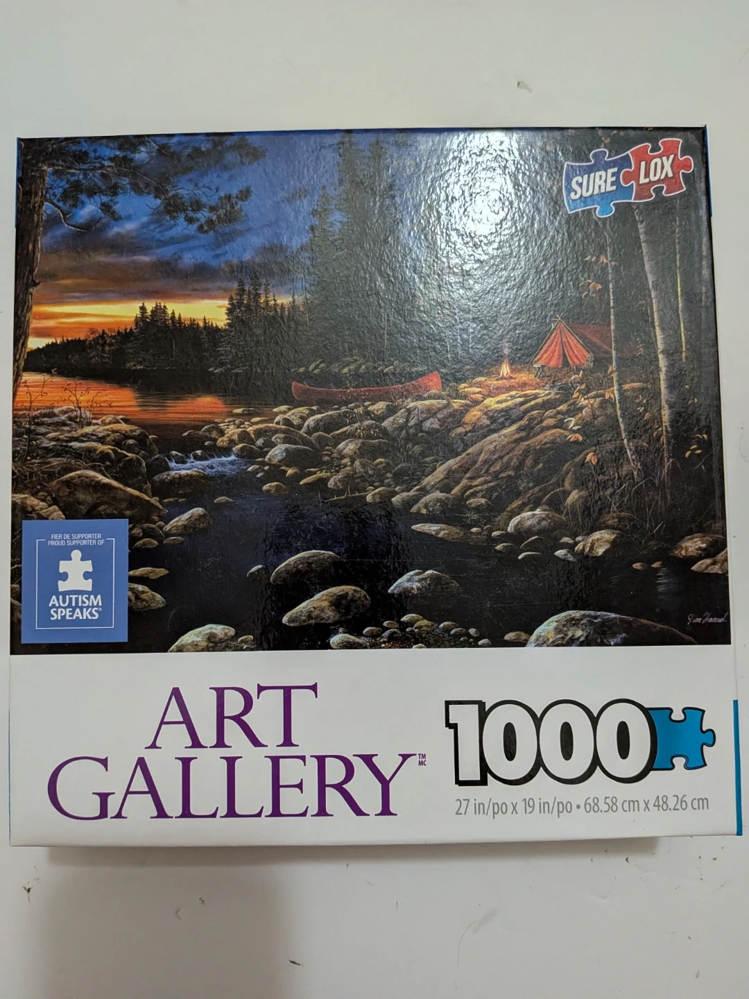 This is a 1000-piece Art Gallery jigsaw puzzle featuring a wilderness camping scene. The puzzle measures 27 x 19 inches (68.58 cm x 48.26 cm). It's made with Sure Lox interlocking technology. This puzzle is a proud supporter of Autism Speaks.