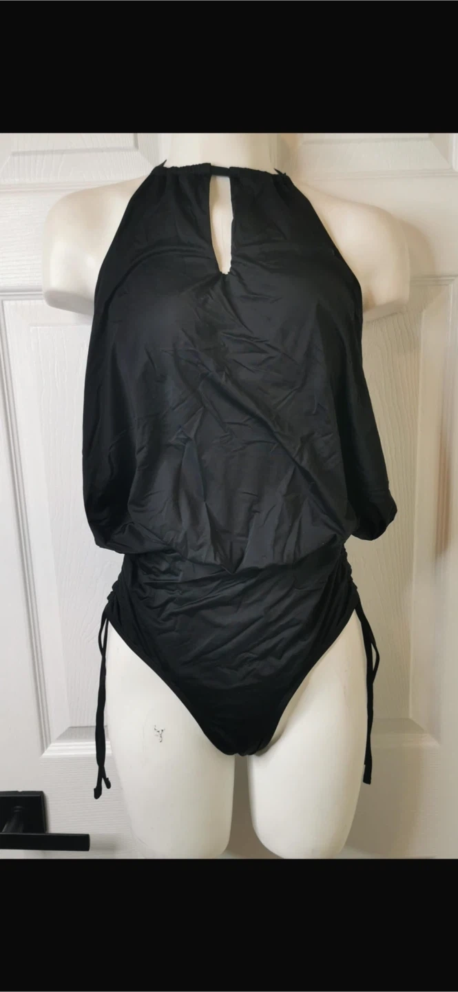 New with tag! This black halter neck swimsuit features a flowy top and ruched sides with adjustable ties. It has a keyhole cutout at the neckline and a flattering blouson silhouette. The material is stretchy and comfortable for beach or pool wear.