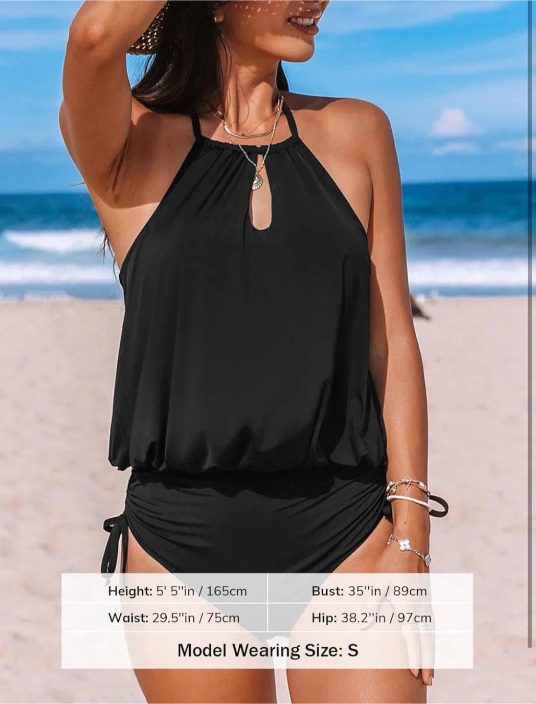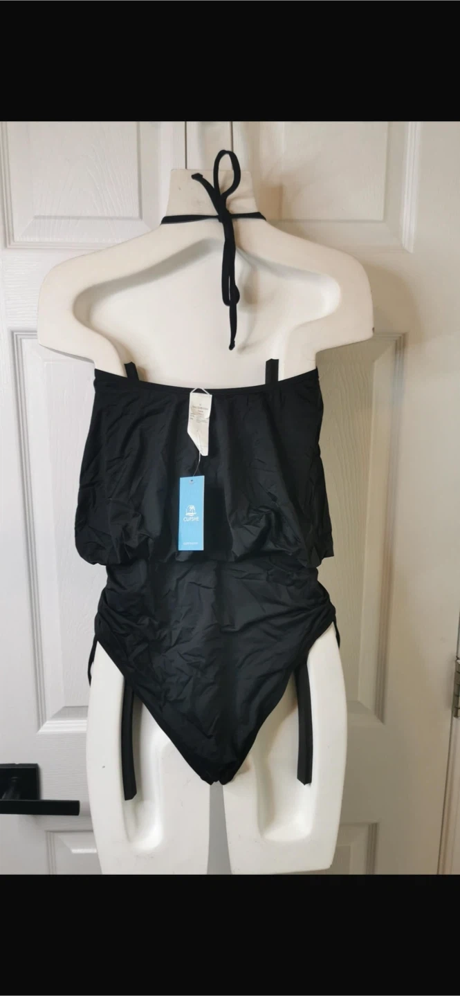 New with tag! This black halter neck swimsuit features a flowy top and ruched sides with adjustable ties. It has a keyhole cutout at the neckline and a flattering blouson silhouette. The material is stretchy and comfortable for beach or pool wear.