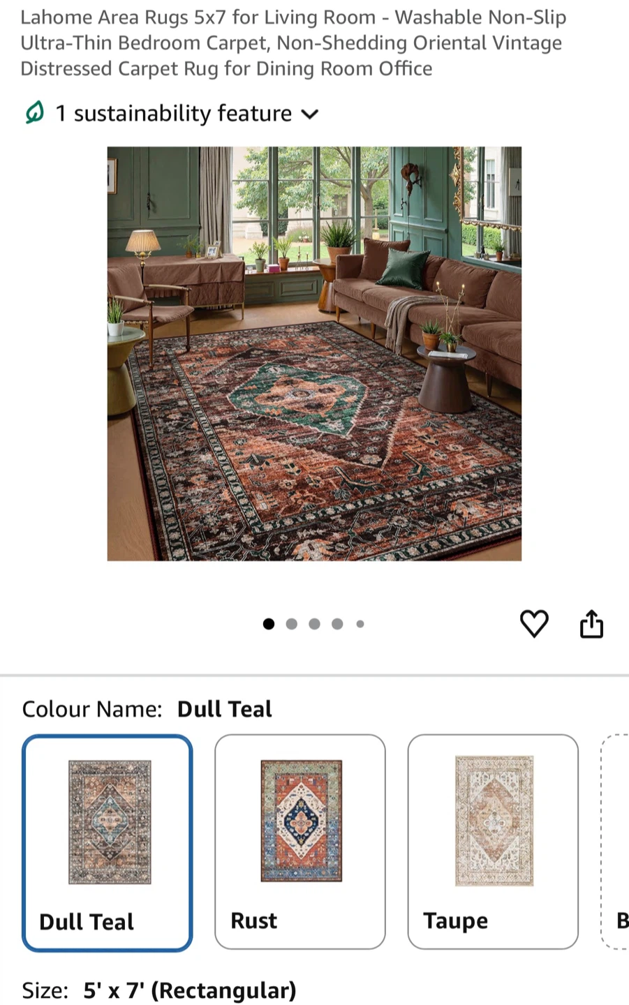 This Lahome area rug measures 5'x7' with a low pile height of 0.15". It's washable and designed to be non-slip. The distressed vintage oriental pattern comes in a dull teal color.