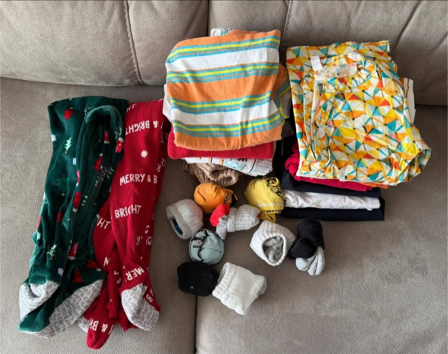 Bundle of baby clothes featuring Carter's Christmas themed footed pajamas and assorted socks. Includes a green Christmas tree print pajama and a red "Merry & Bright" pajama. Assorted socks in various colours and patterns are also included. Perfect for keeping little ones cozy!