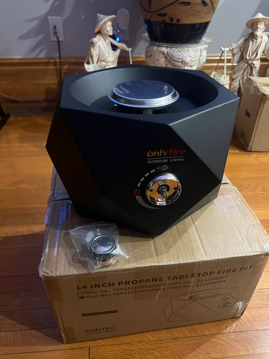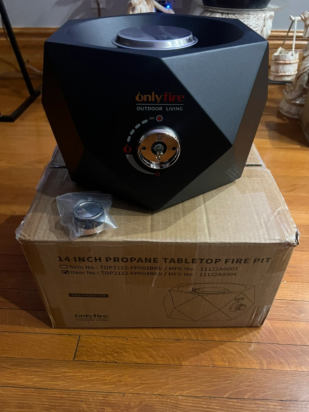 This is a 14-inch propane tabletop fire pit from Onlyfire. It's designed for outdoor living and includes a regulator. The item comes in its original box.