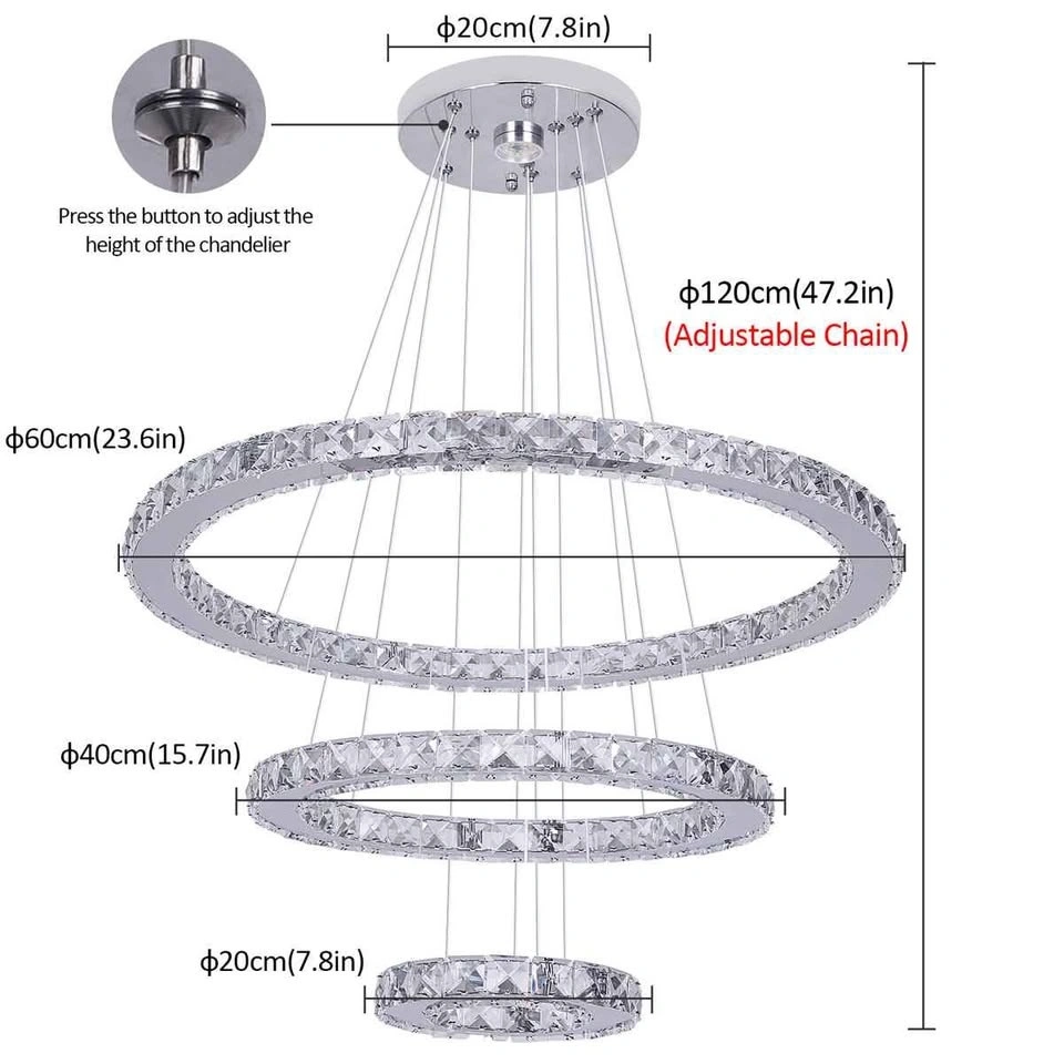 The height can be adjusted to suit your different preferences and needs. There are models with cool white light, warm yellow light, and adjustable light settings. Please pay attention to the style when ordering. You need to connect to the circuit installation; it is recommended that two people install it. Pay attention to safety. The 3 rings can be installed at any angle, and changing the angle offers a completely new shape.