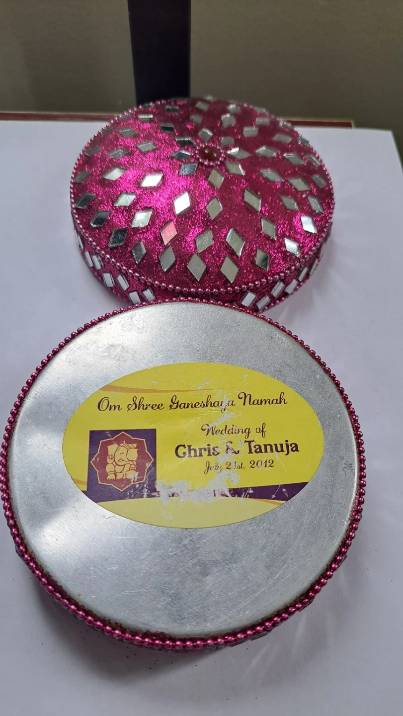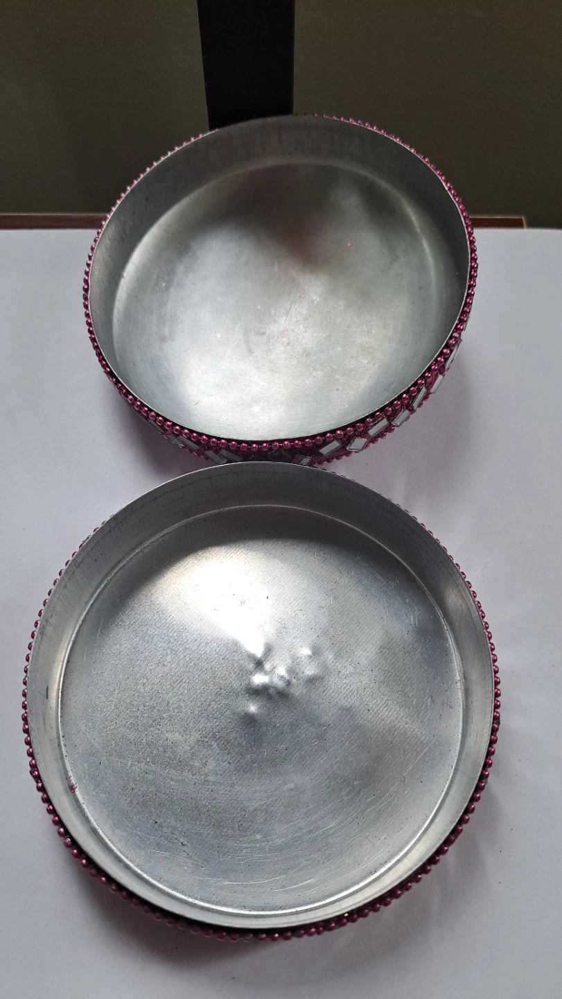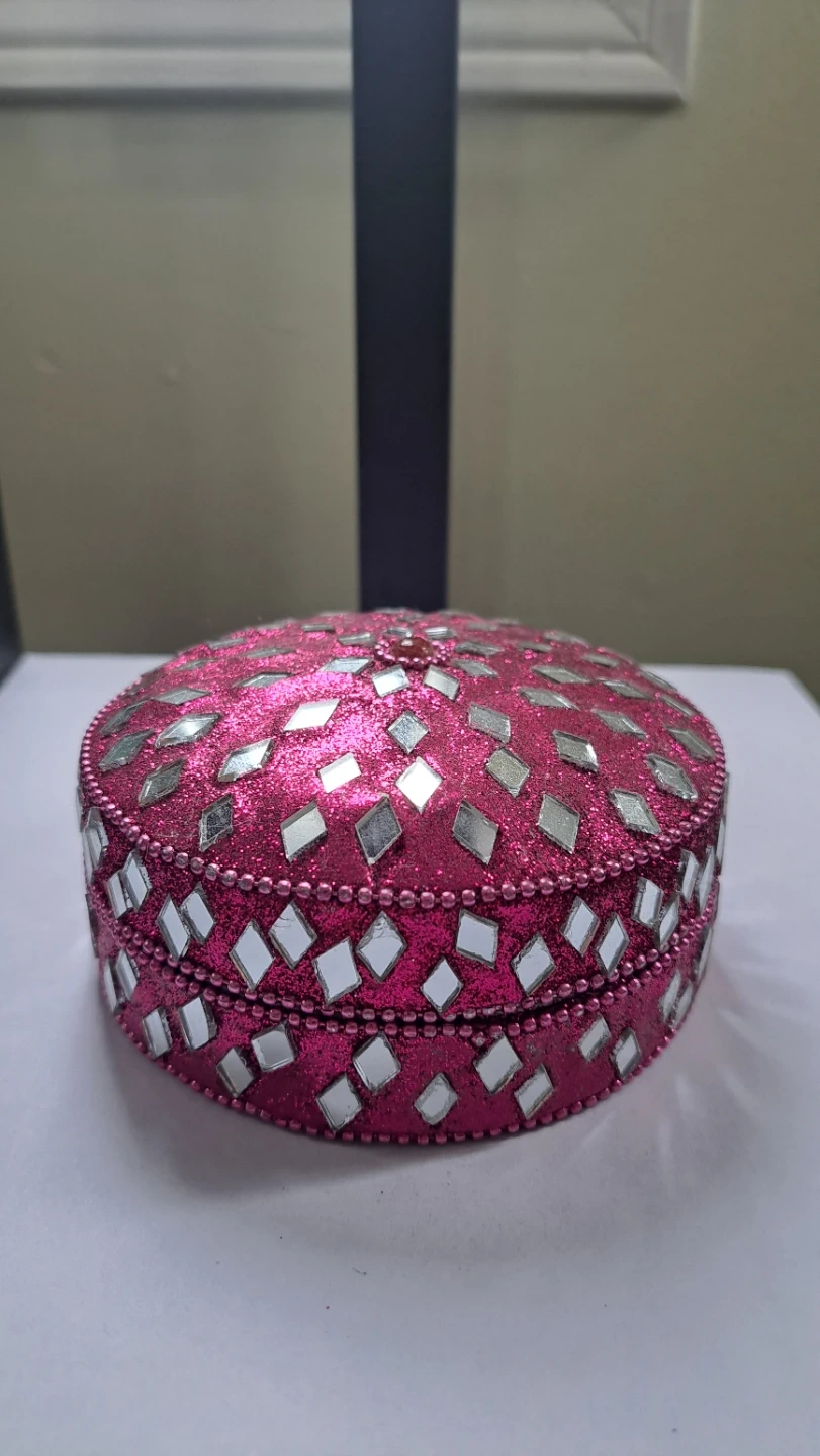 This decorative tin box is covered in pink glitter and features a mirror mosaic design with beaded trim. It's perfect for storing small trinkets or as a unique decorative piece. The tin is made of metal.