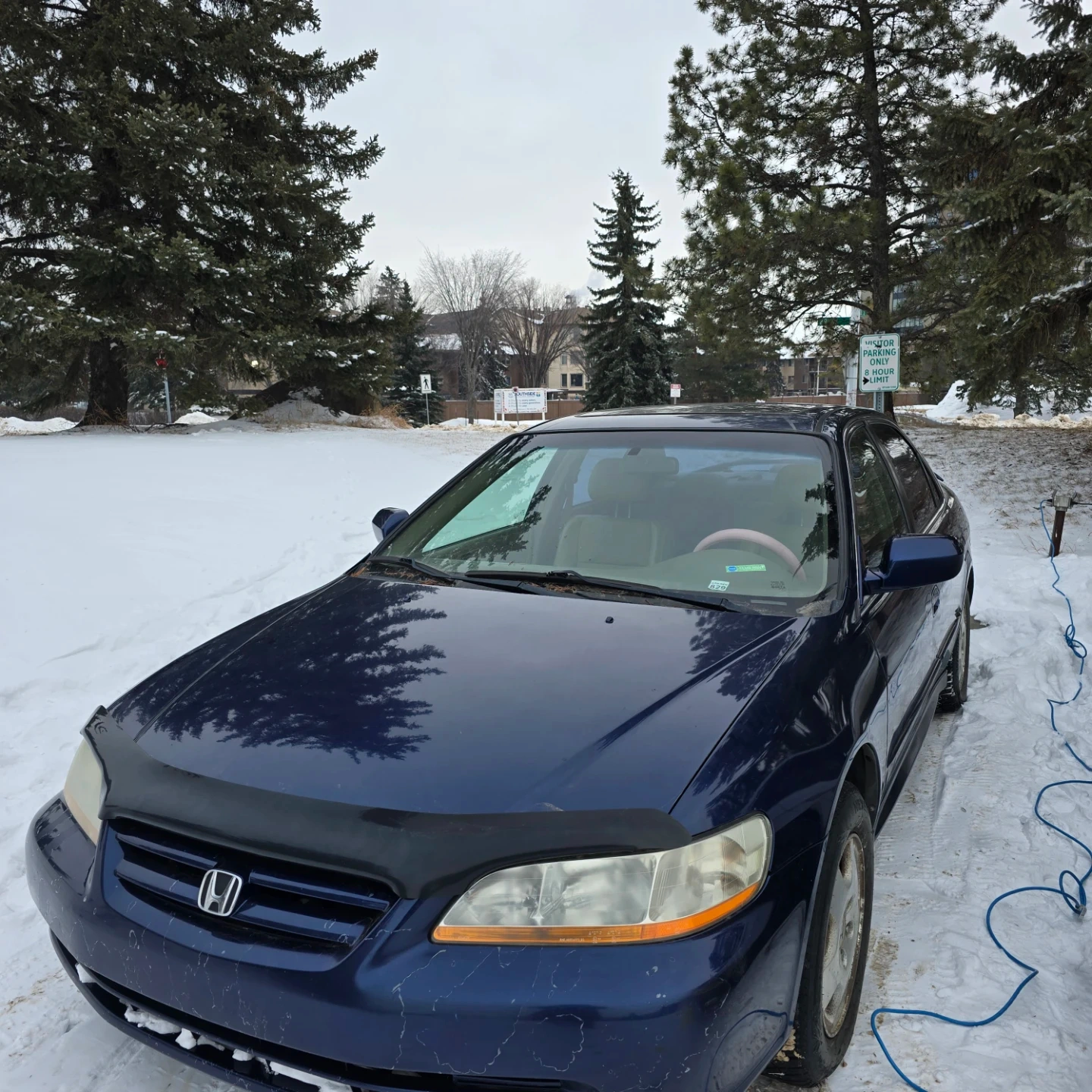 This is a blue Honda Accord sedan. It has a sunroof and alloy wheels. The car is 2002.