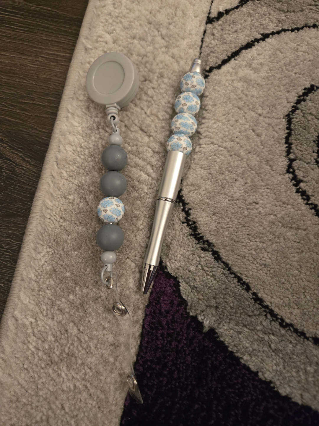 This set includes a silver retractable badge reel with gray beads and a beaded pen. The beads on the pen are light blue with a floral pattern and are accented by gray beads. It's a fun accessory for work or school!