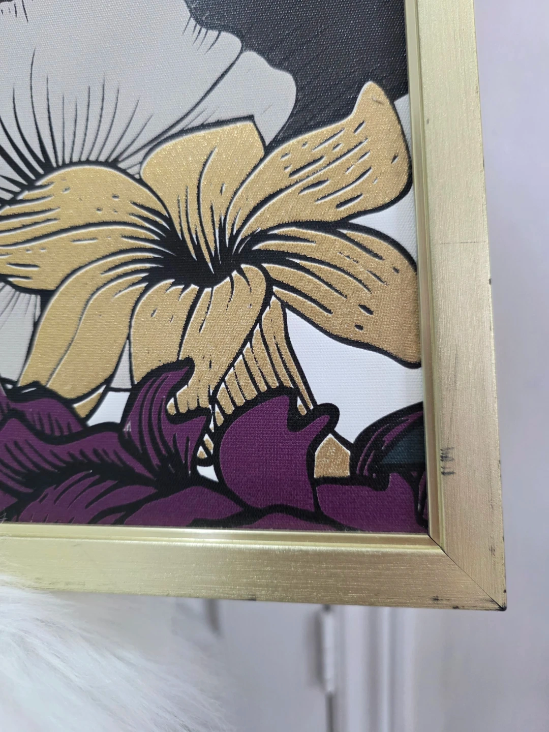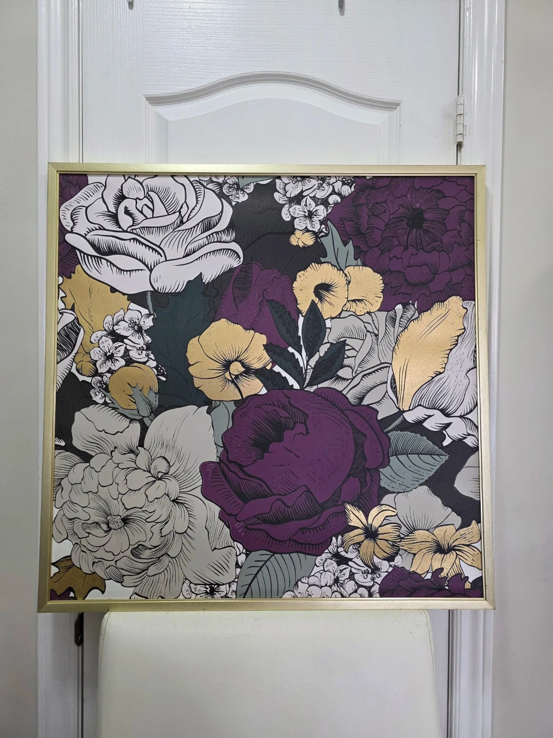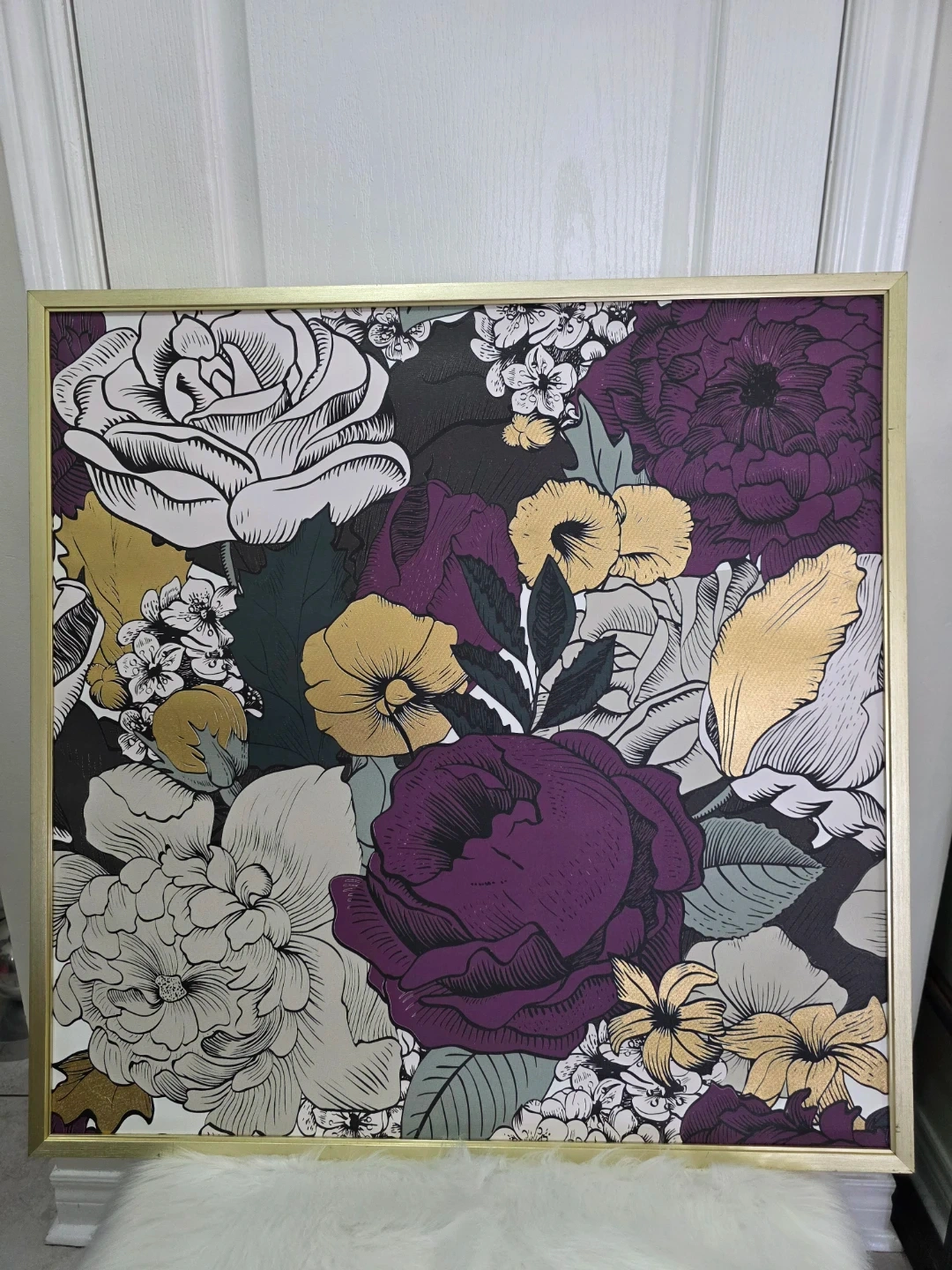 Beautiful framed artwork featuring a vibrant floral design. The frame is gold-toned metal. Dimensions are approximately 29 inches tall by 29 inches wide.
