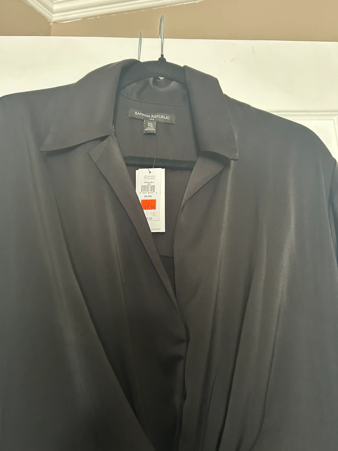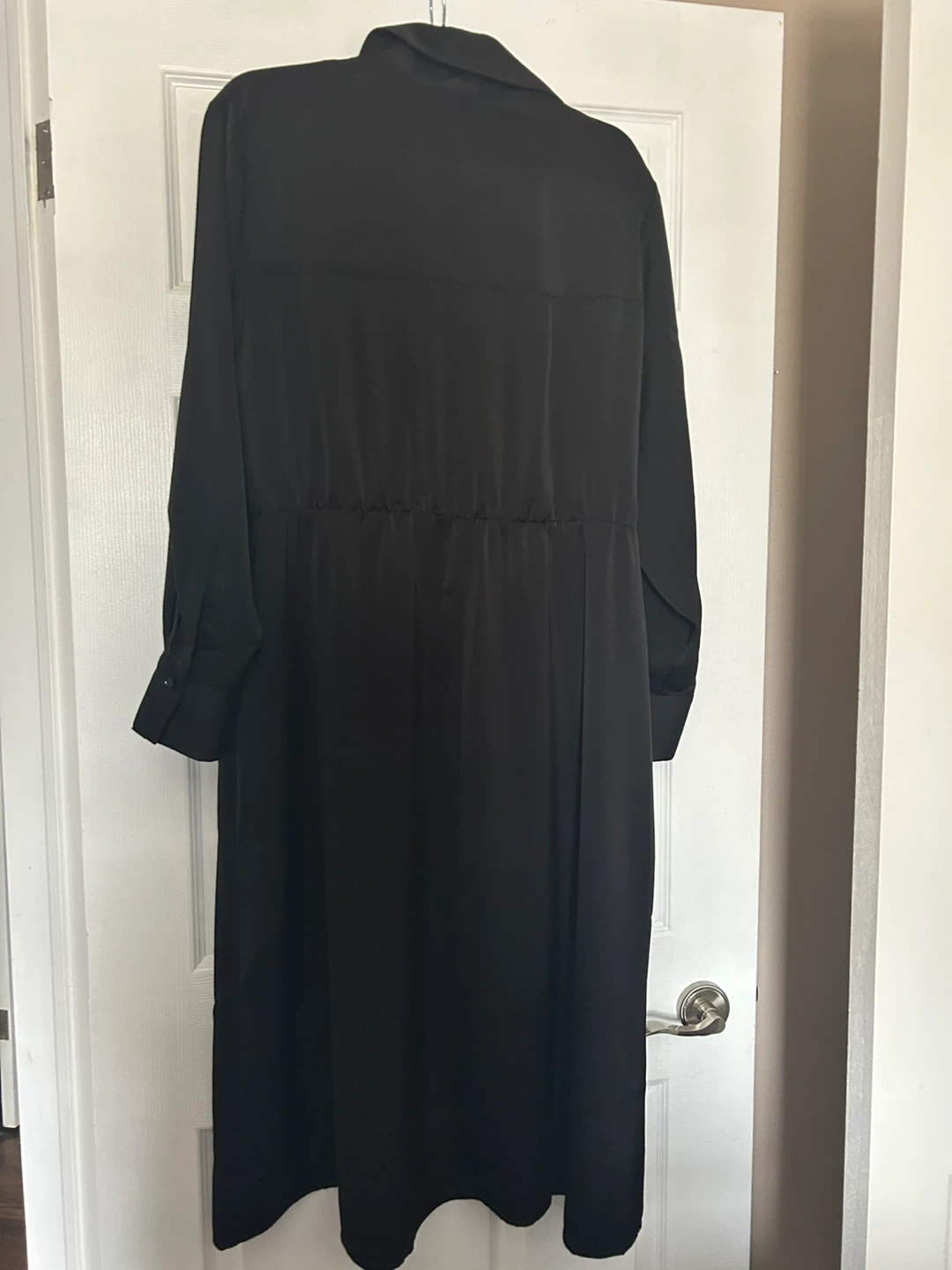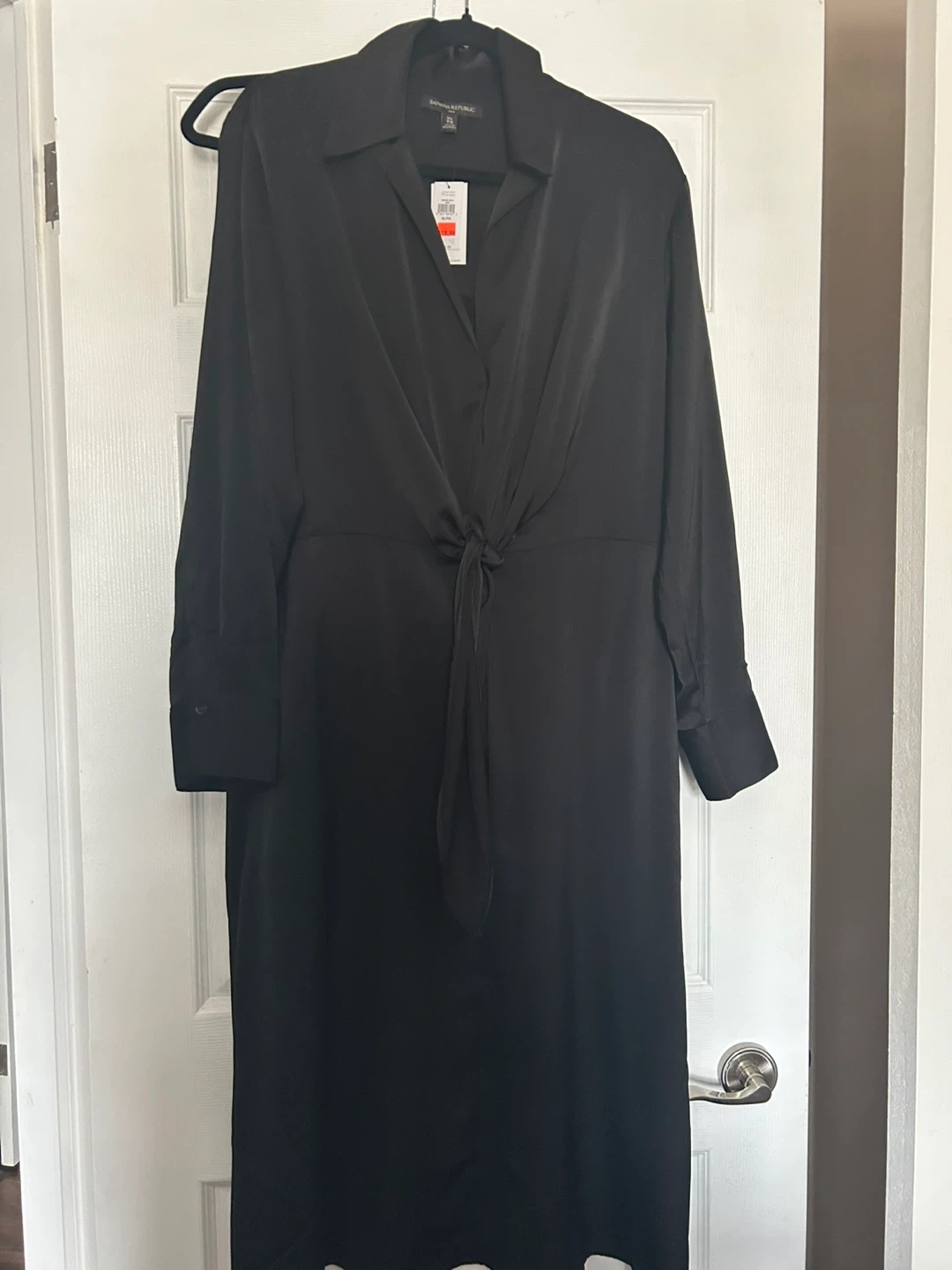 Banana Republic black long-sleeve shirt dress. It features a classic collar and a tie-front detail. Size is XLThis dress is made from a silky material. Brand new with tag attached