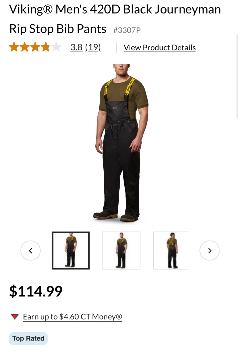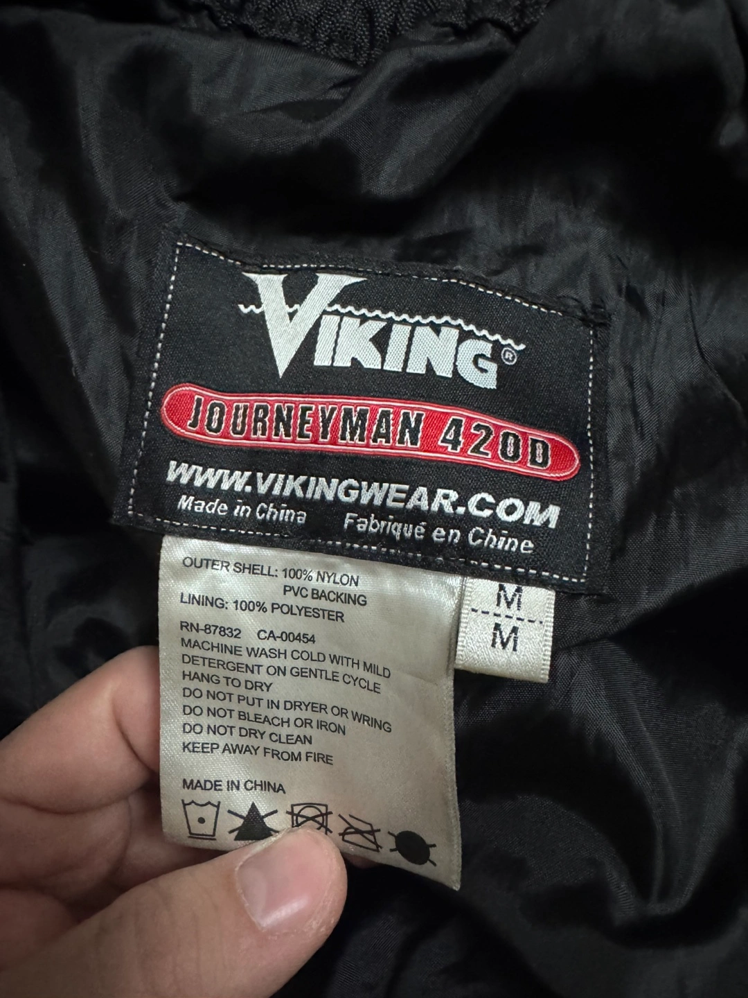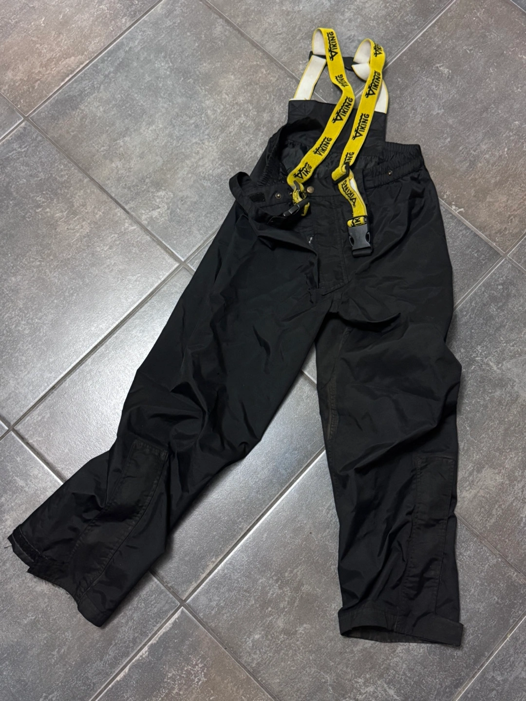 Black Viking Journeyman 420D ripstop bib pants. Size Medium. Yellow suspenders included. Made in China. Waterproof. Good for outdoor work