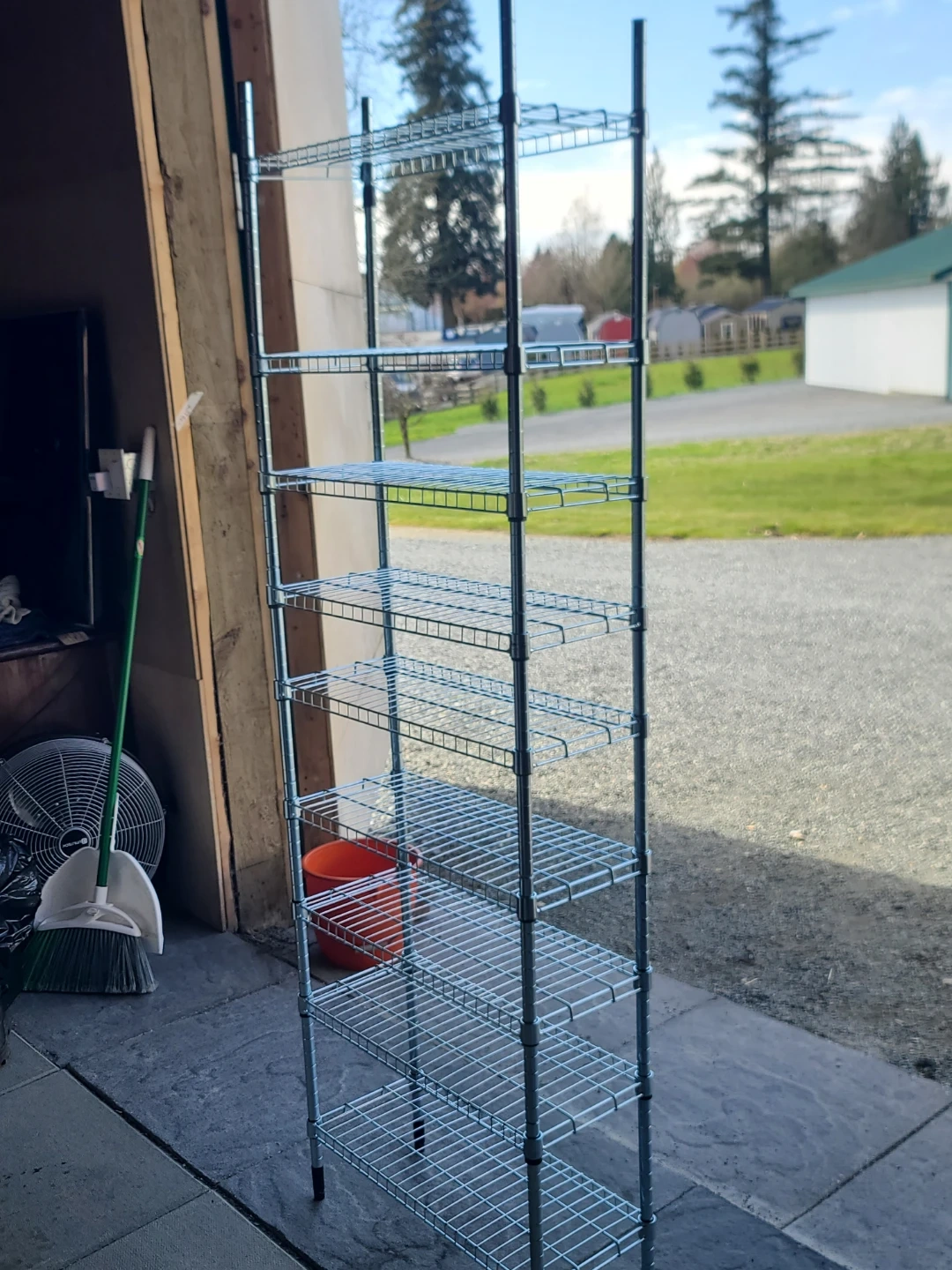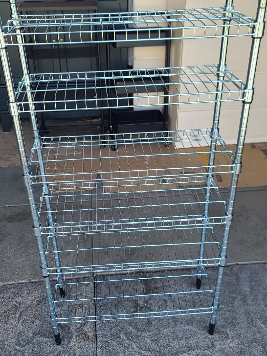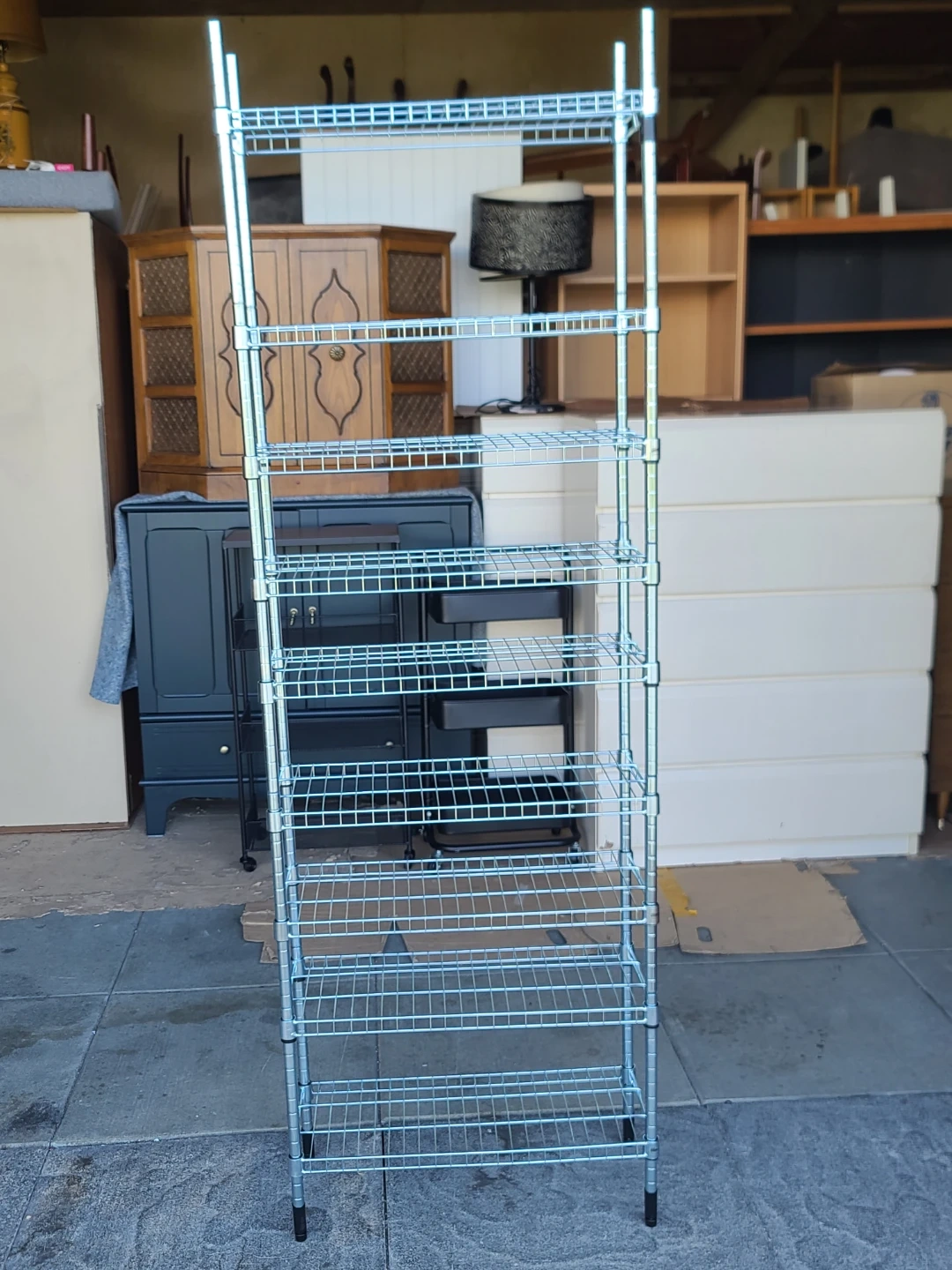 This is a multi-tier wire shelving unit. It's made of metal with a chrome finish. This unit has 8 shelves, offering lots of storage space. Delivery can be arranged. Viewing and pickup by appointment.