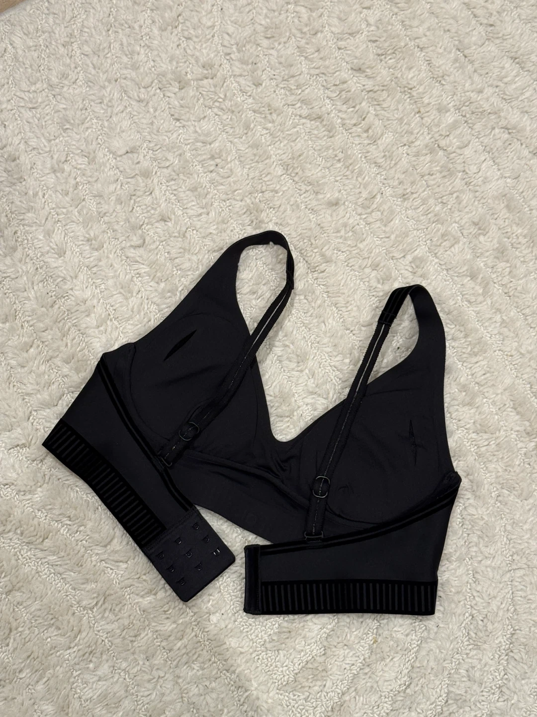 This Alo black sports bra is made for comfort and support. It features adjustable straps and a banded hem. Great for workouts or everyday wear!