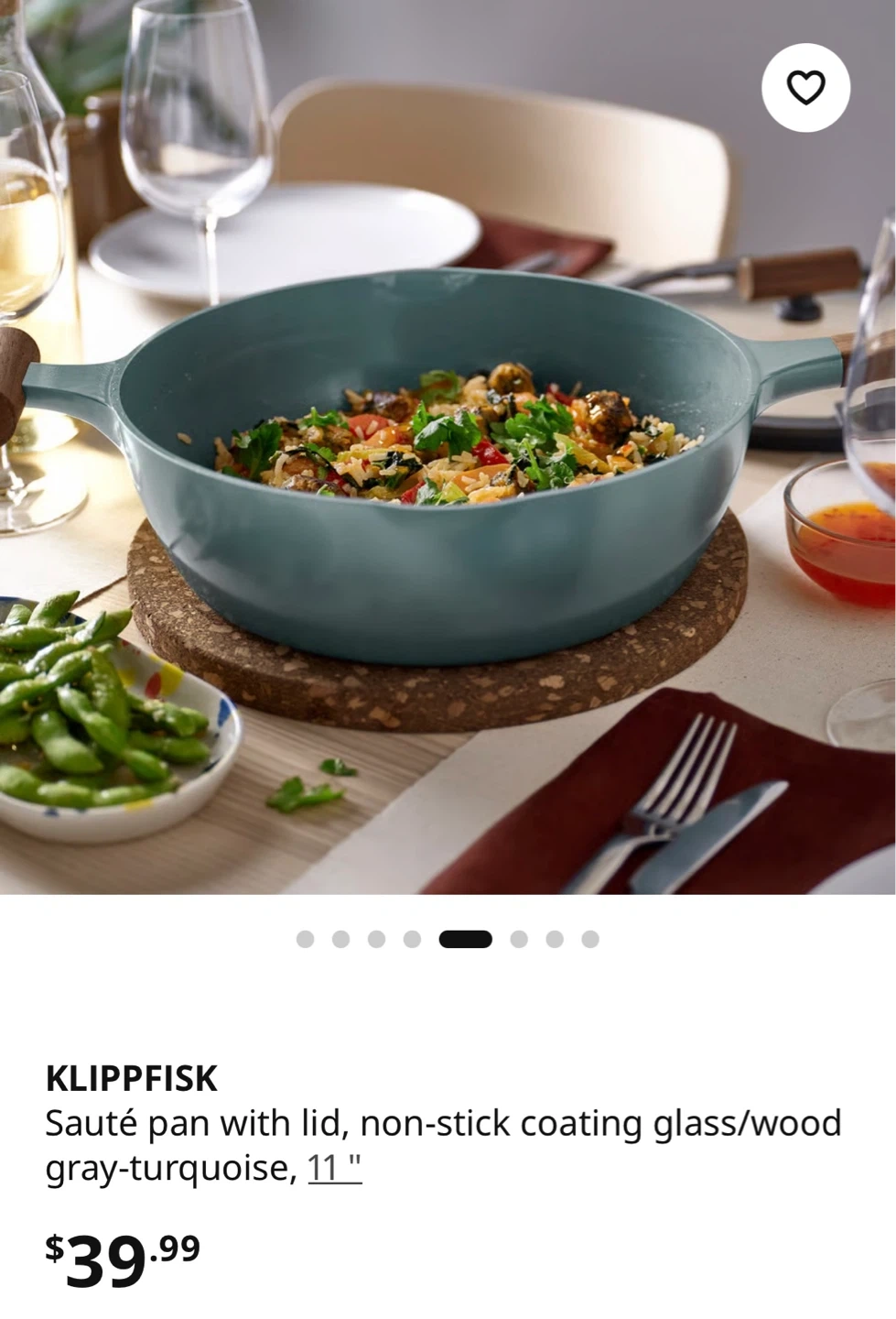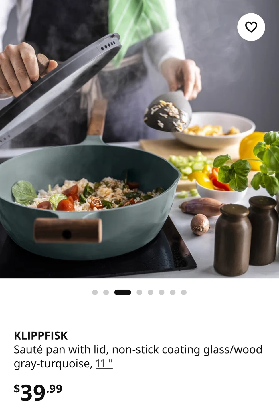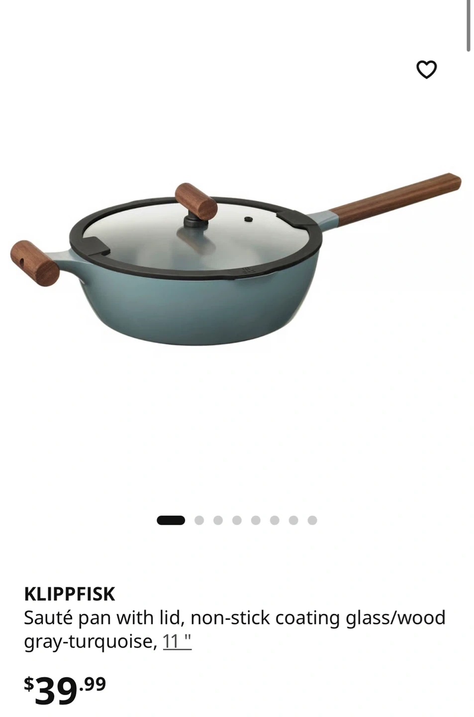 [✨BrandNew✨] This is the IKEA KLIPPISK sauté pan with a lid. It's designed with a non-stick coating. The pan and lid handles are made of wood. It's 11 inches in size. Its color is gray-turquoise. This pan is suitable for general cooking needs. It comes with a glass lid.