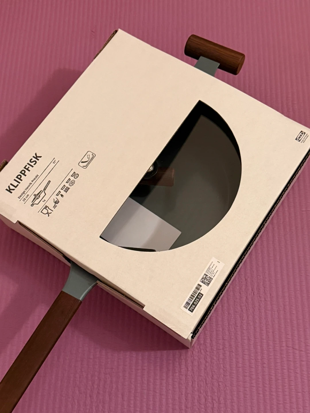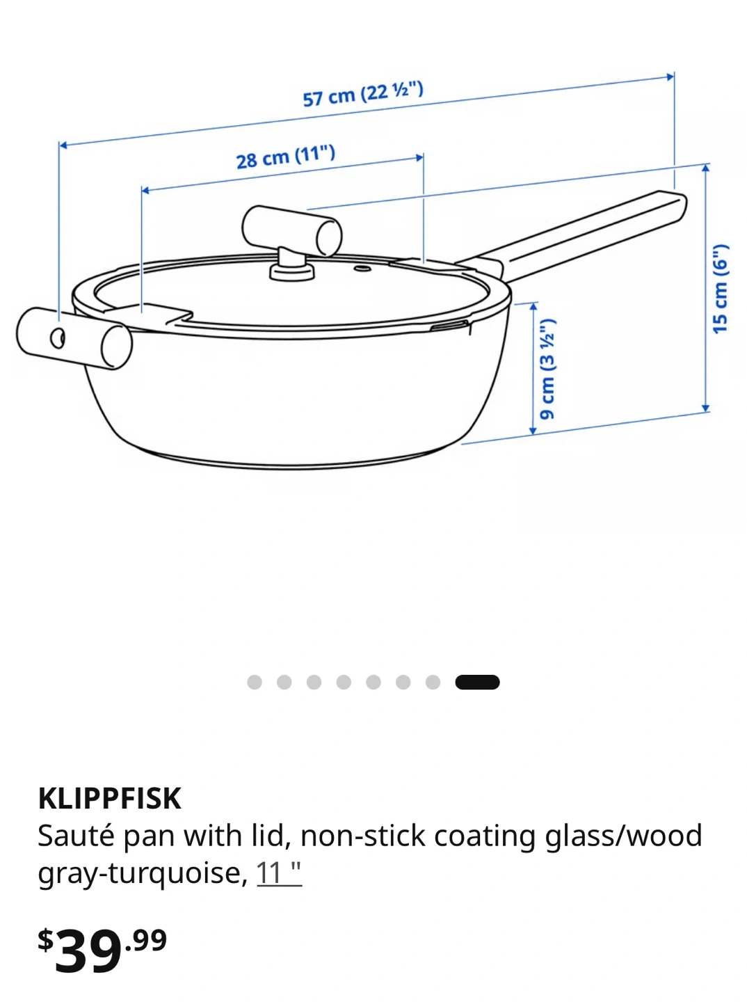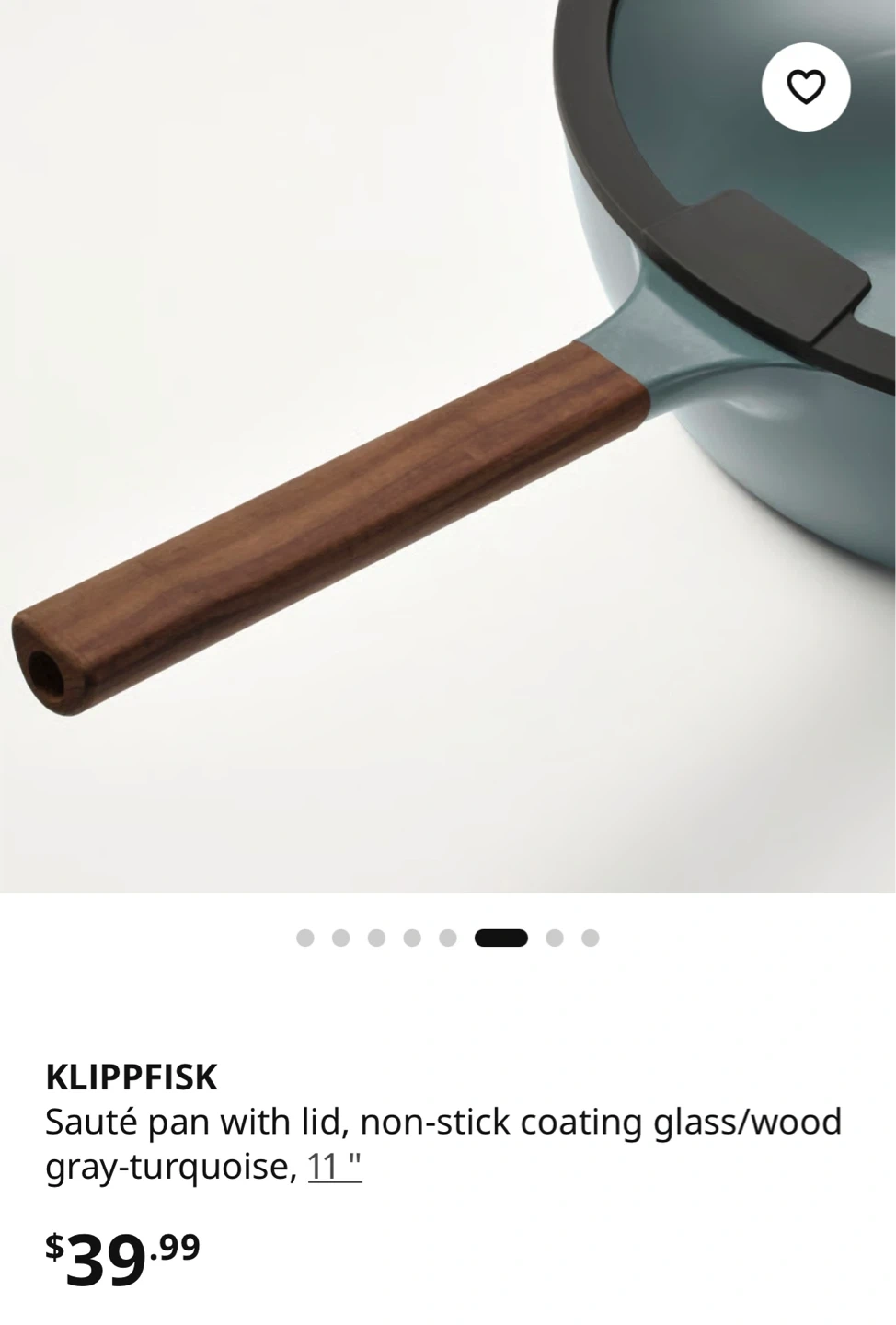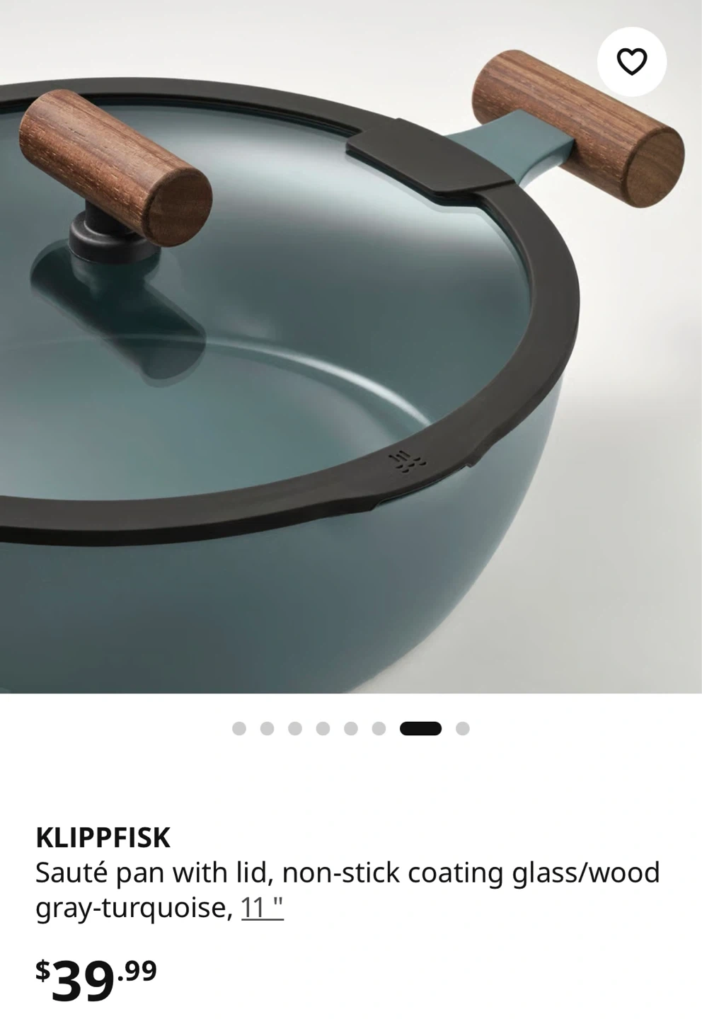 [✨BrandNew✨] This is the IKEA KLIPPISK sauté pan with a lid. It's designed with a non-stick coating. The pan and lid handles are made of wood. It's 11 inches in size. Its color is gray-turquoise. This pan is suitable for general cooking needs. It comes with a glass lid.