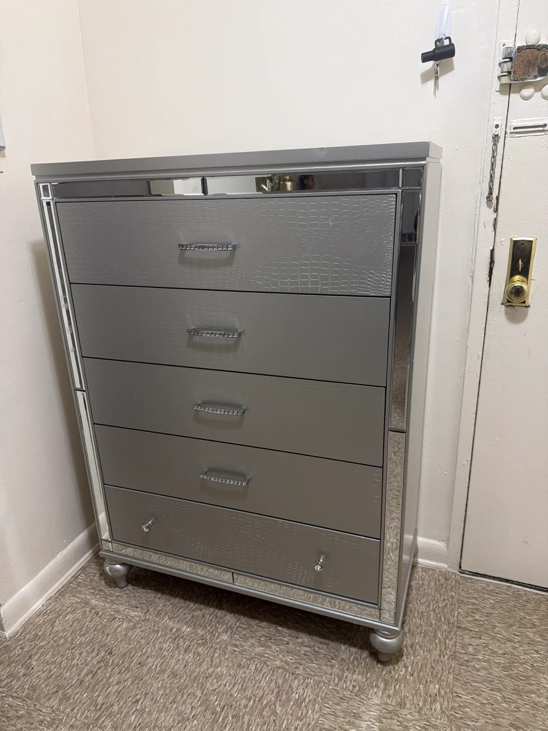 This silver chest features five drawers with crystal-like handles. It has mirrored trim along the sides and a faux crocodile texture on the top drawer fronts. Offers ample storage space.