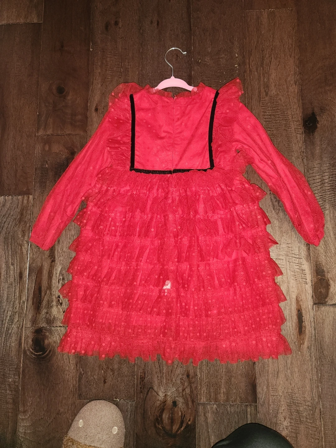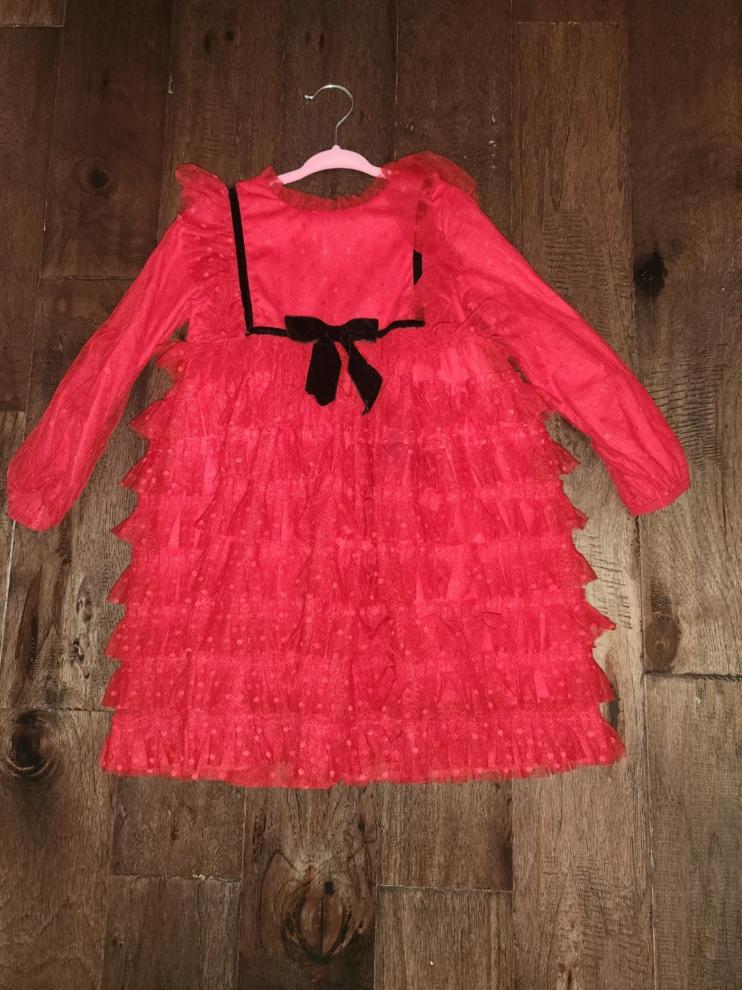 This adorable red dress features a ruffled tulle skirt with a polka dot pattern. It has long sleeves and a decorative black ribbon bow at the waist. It's perfect for parties or special occasions!great for age 3-4 depending on the overall size of your kid.