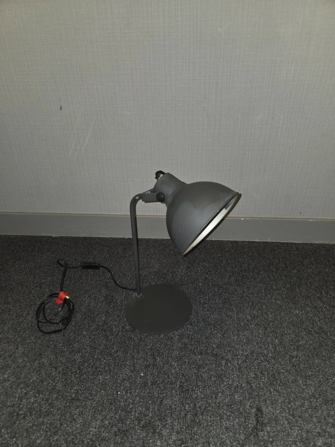 This is a Structube grey desk lamp with an adjustable arm and head. It has a sturdy base and a black cord with an inline on/off switch. The lamp is made of metal. In great working condition.