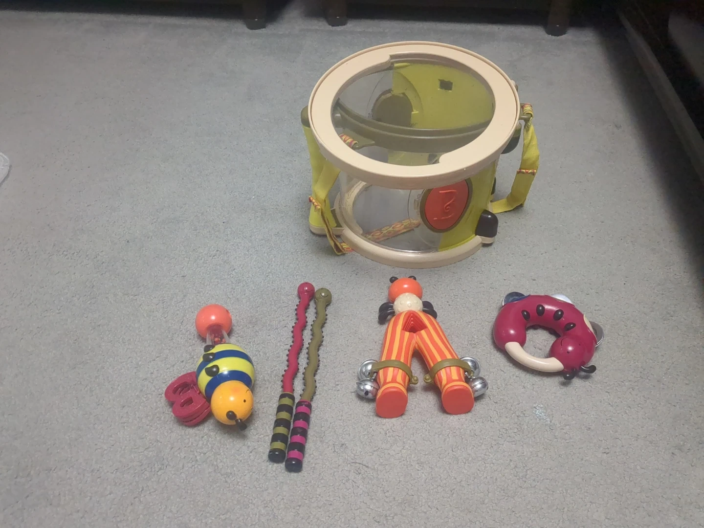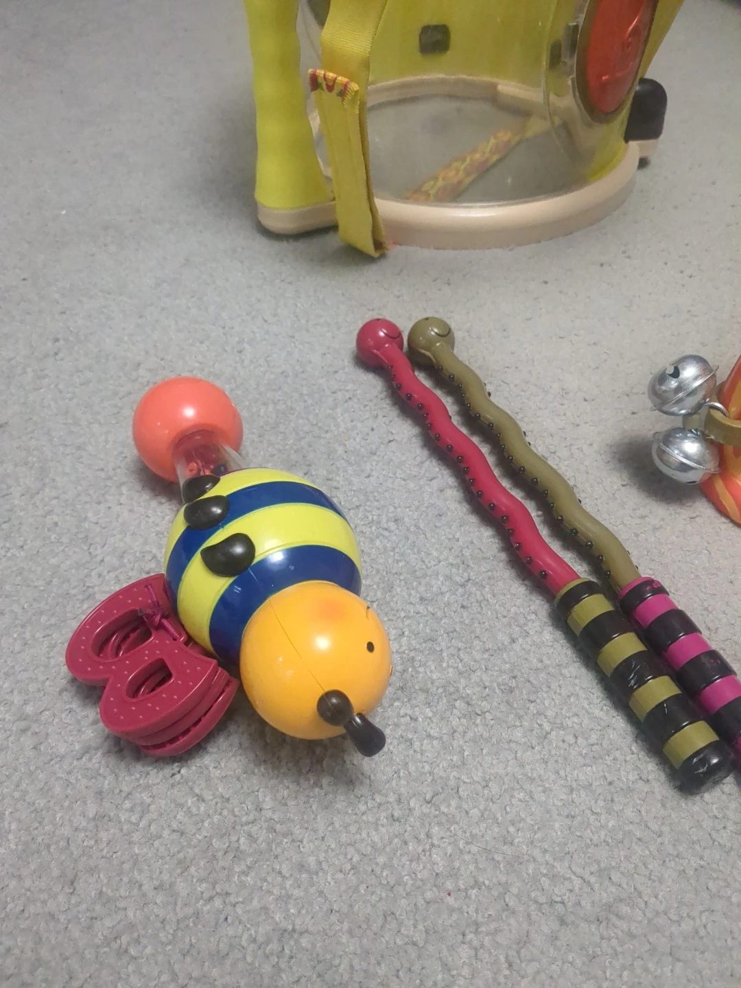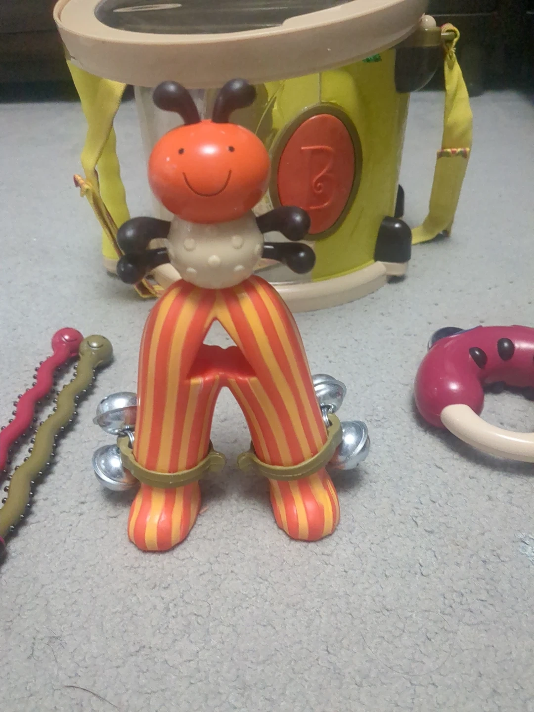 This Baby Einstein musical toy set includes a drum, a ladybug rattle, a bee rattle, two shakers, and an alphabet character. It's designed for little ones to explore sounds and music. Perfect for developing motor skills and auditory senses!