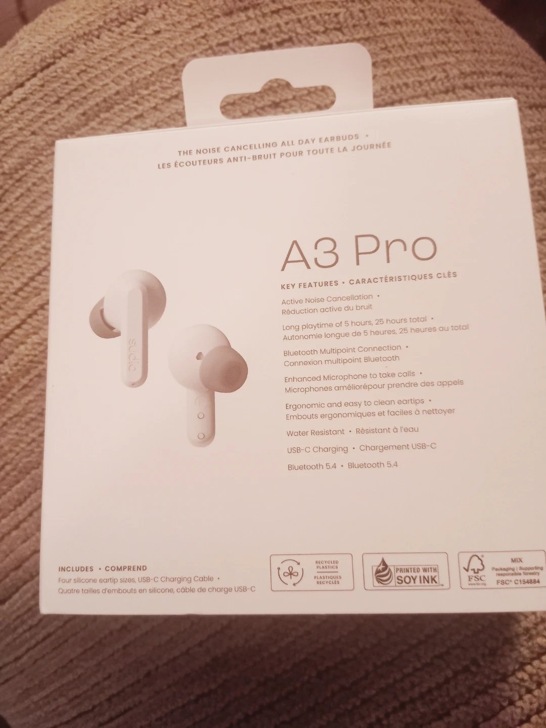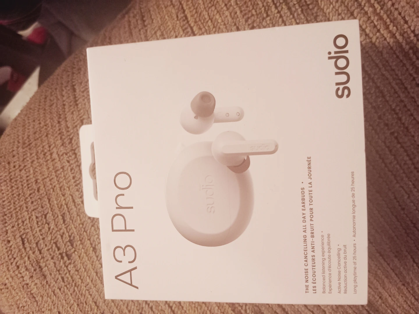 Selling a brand new pair of Sudio A3 Pro noise cancelling earbuds! They feature active noise cancellation, a long playtime of 5 hours (25 hours total), and Bluetooth multipoint connection. They're also water resistant, have a USB-C charging port, and use Bluetooth 5.4. Included are four silicone eartip sizes and a USB-C charging cable. The box is included!