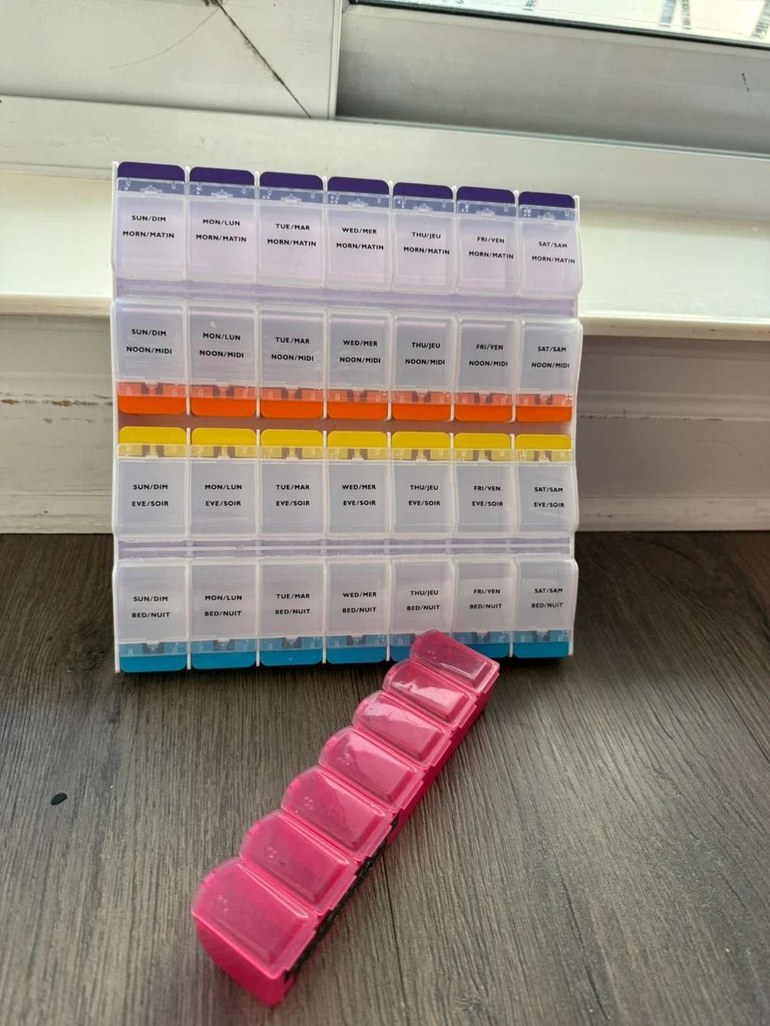 This pill organizer has compartments for four doses per day: morning, noon, evening, and bedtime. It's designed to help you keep track of your medications throughout the week. Each day's section is removable for easy portability.