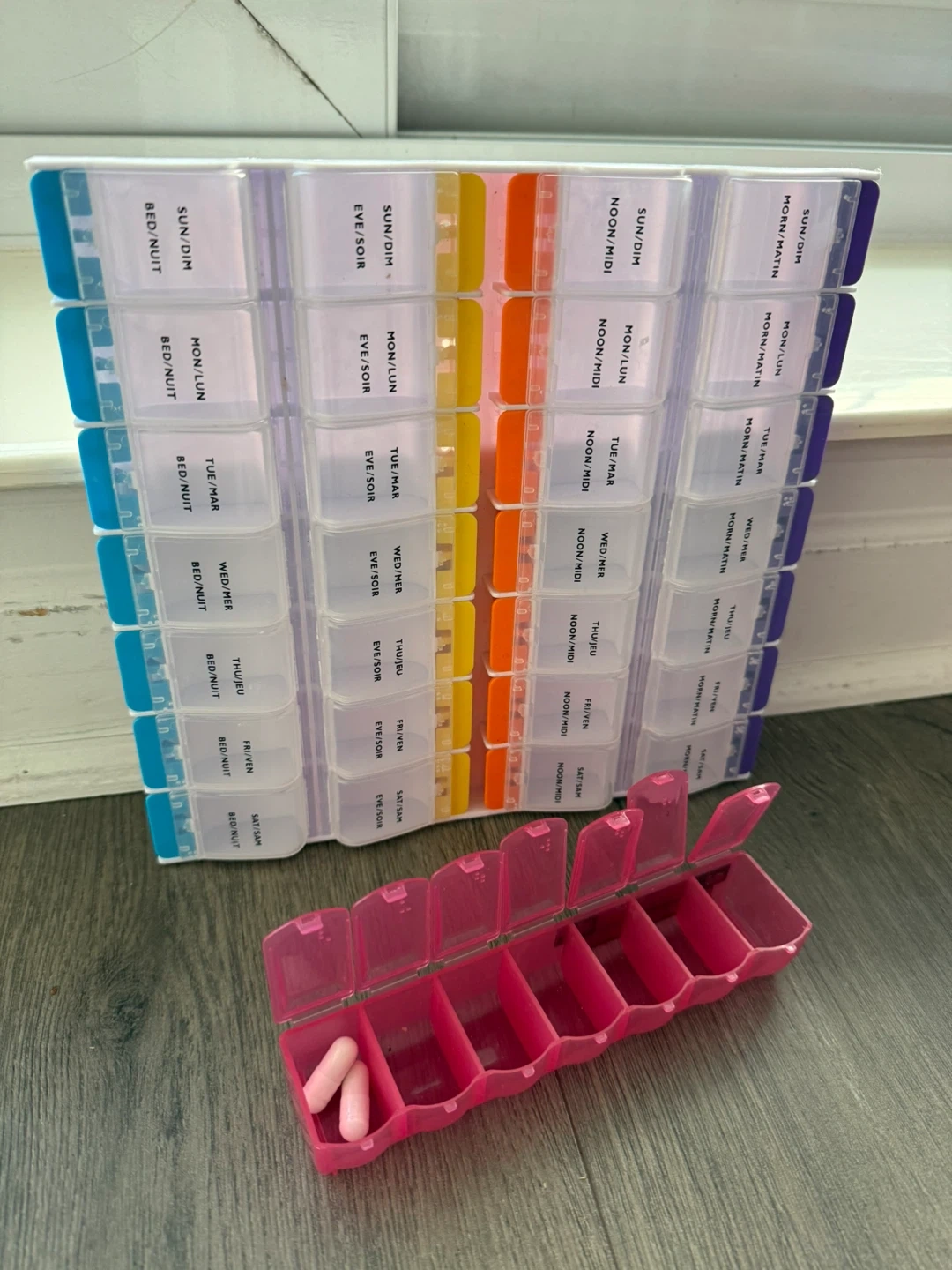 This pill organizer has compartments for four doses per day: morning, noon, evening, and bedtime. It's designed to help you keep track of your medications throughout the week. Each day's section is removable for easy portability.