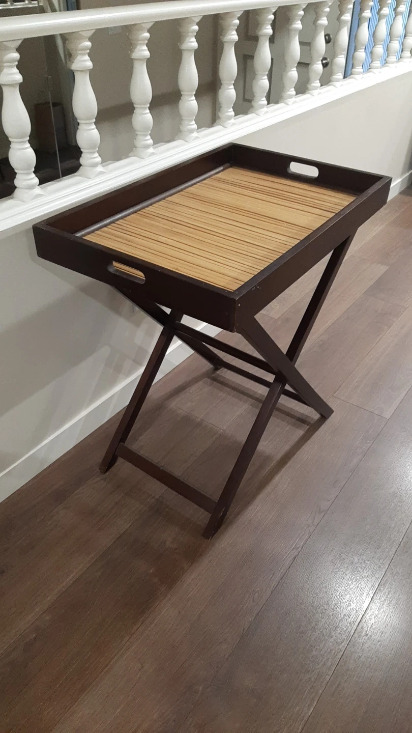 Convenient folding tray table with a dark brown frame. The top surface is made of natural bamboo. It's perfect for serving snacks or drinks.