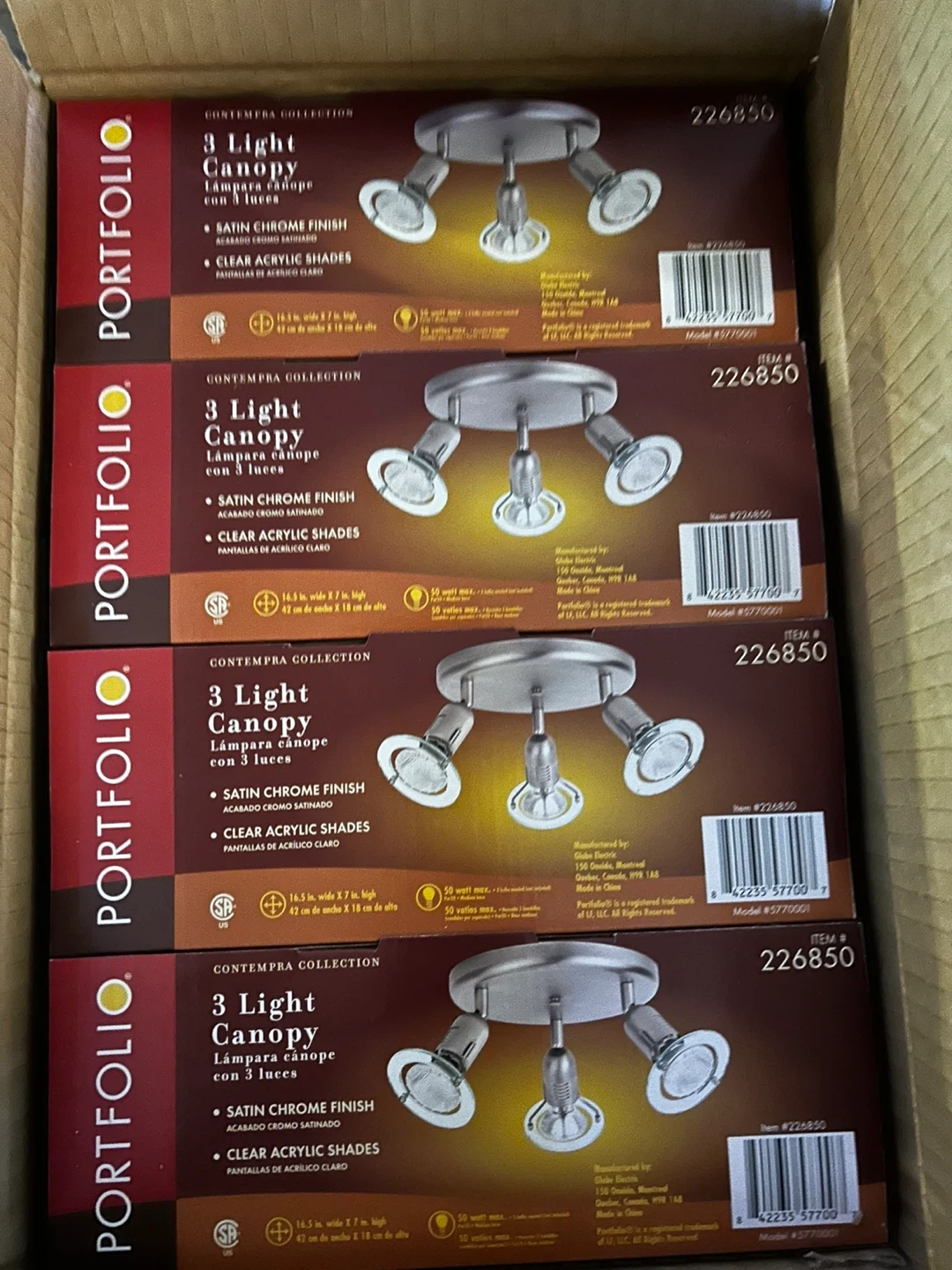 Update your home lighting with these sleek, modern 3-light canopy fixtures from the Portfolio Contempra Collection. All units are brand new, never opened, and still in their original factory packaging.