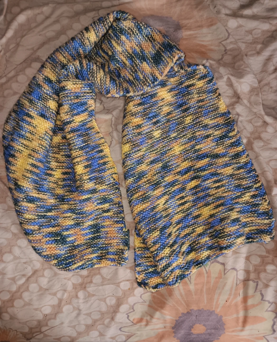 This is a hand-knitted scarf. It features a vibrant mix of yellow, blue, and green yarns. The knit pattern is a classic garter stitch. Keep warm this season!