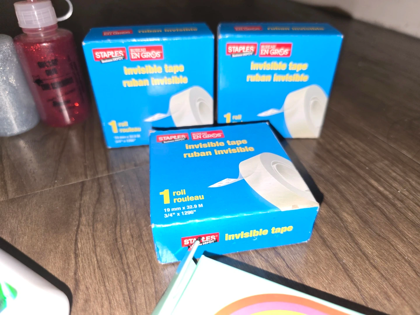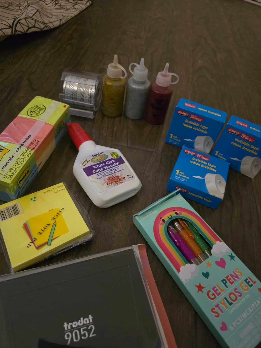 This bundle includes Post-it notes, white glue, Staples invisible tape, glitter pens, and assorted craft tape. Also contains a black stamp. Perfect for school projects or crafting endeavours! Text what you need to know the prices.