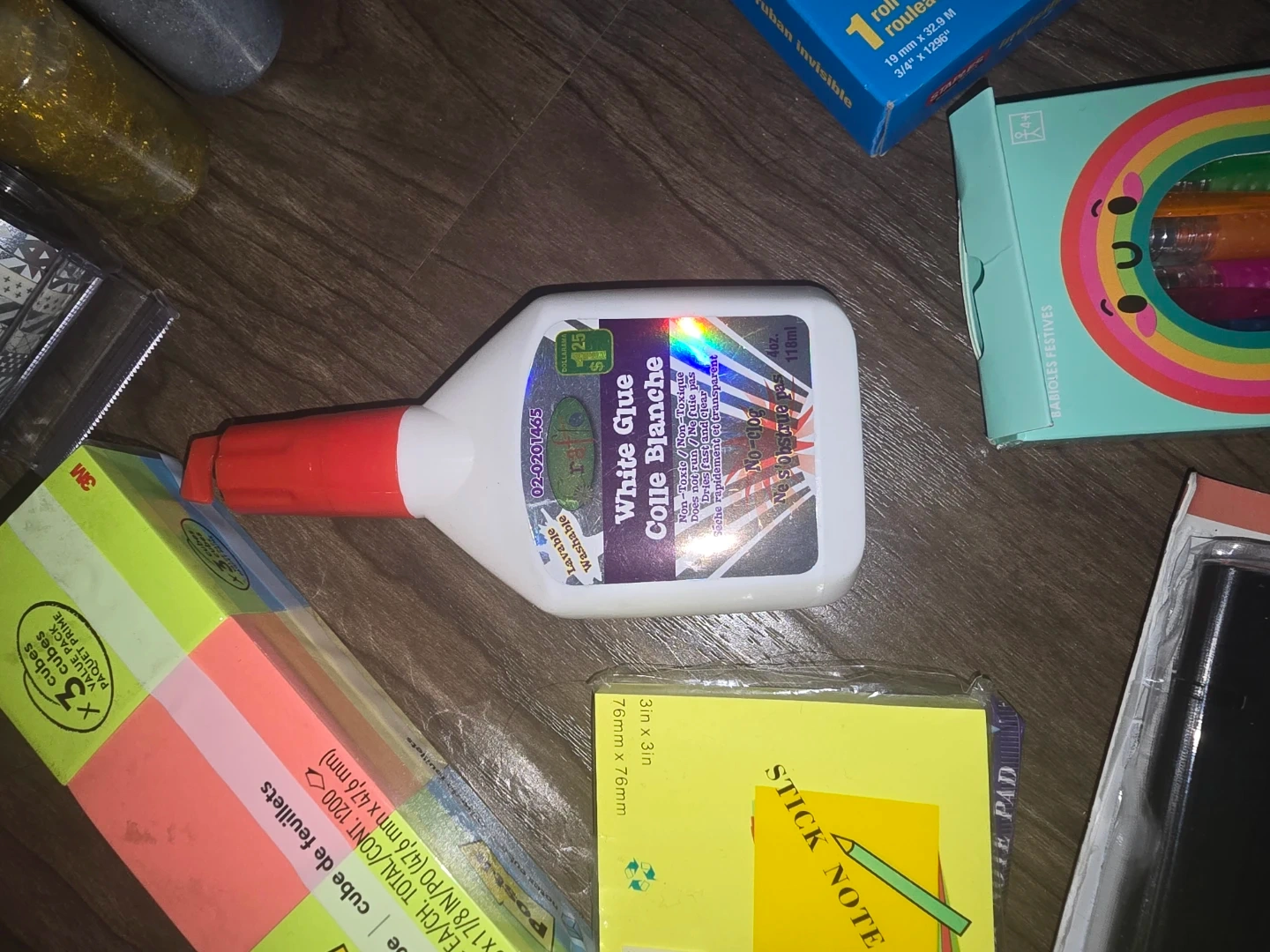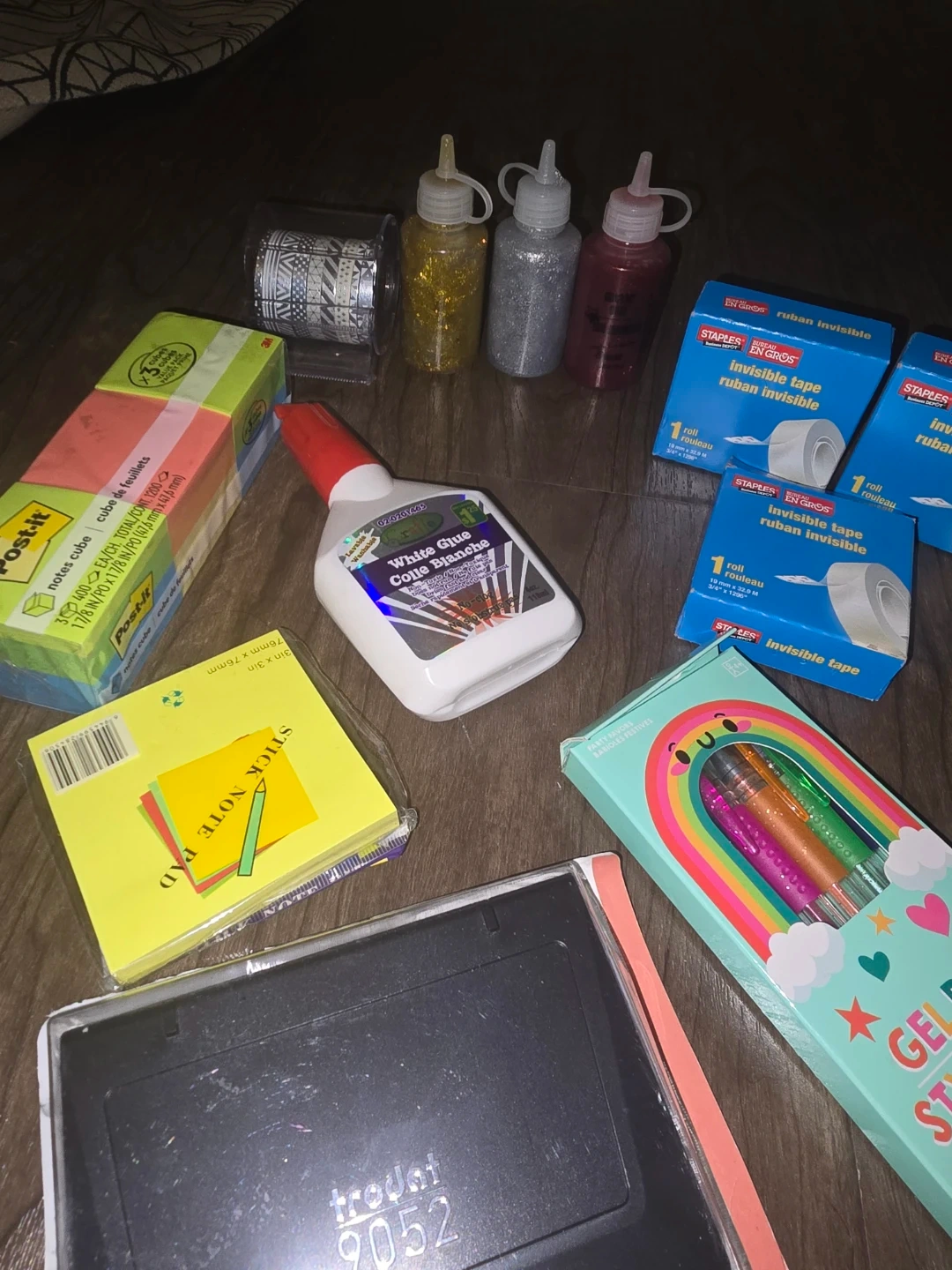 This bundle includes Post-it notes, white glue, Staples invisible tape, glitter pens, and assorted craft tape. Also contains a black stamp. Perfect for school projects or crafting endeavours! Text what you need to know the prices.